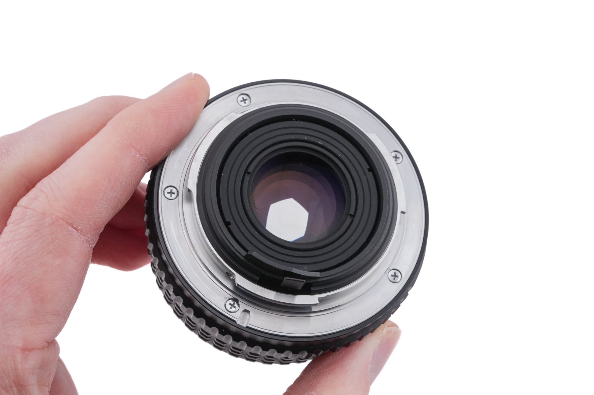 Manual focus normal lens made for K-mount 35mm SLR cameras introduced by Pentax. Early models were all-metal, but after the release of the Pentax-A line, some plastic parts were used. Metal and plastic body available in black.