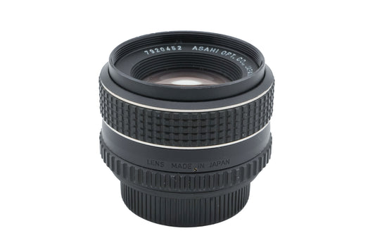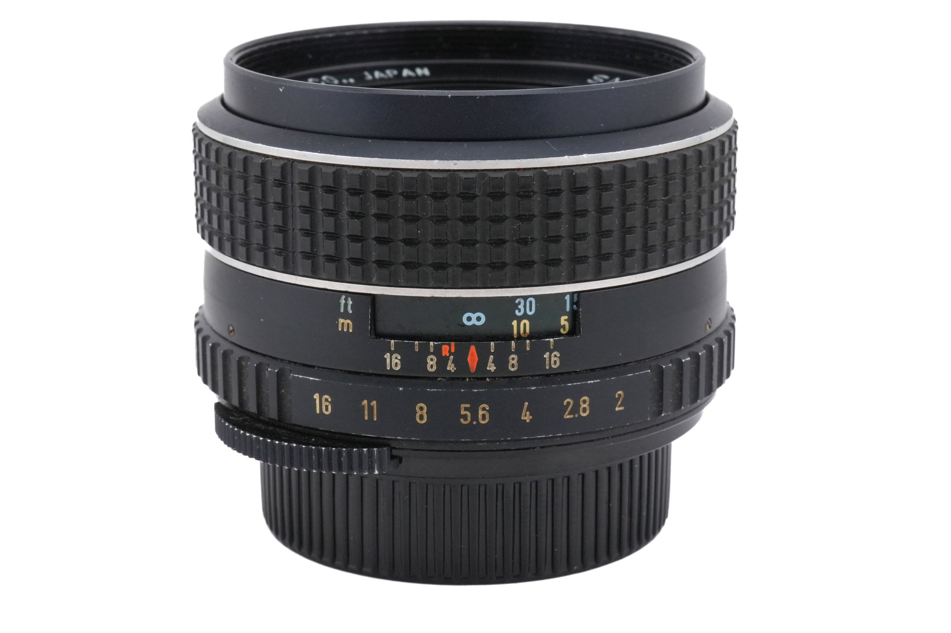 Manual focus normal lens made for M42 mount 35mm SLR cameras by Pentax. Metal body available in black.