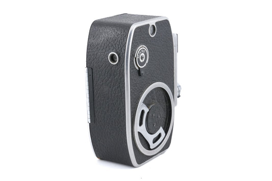 Manual focus 8mm movie film camera made by Bolex. Metal body available in black.