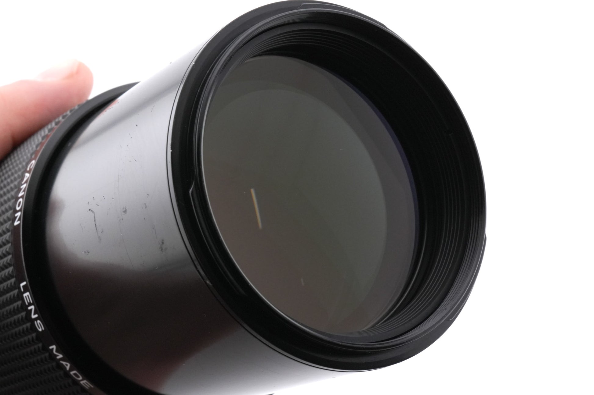 Manual focus push/pull telephoto zoom lens made for FD-mount SLR cameras introduced by Canon in 1980. Uses Canon's newer style FDn locking bayonet. Has in-between aperture stops. Plastic and metal body available in black.