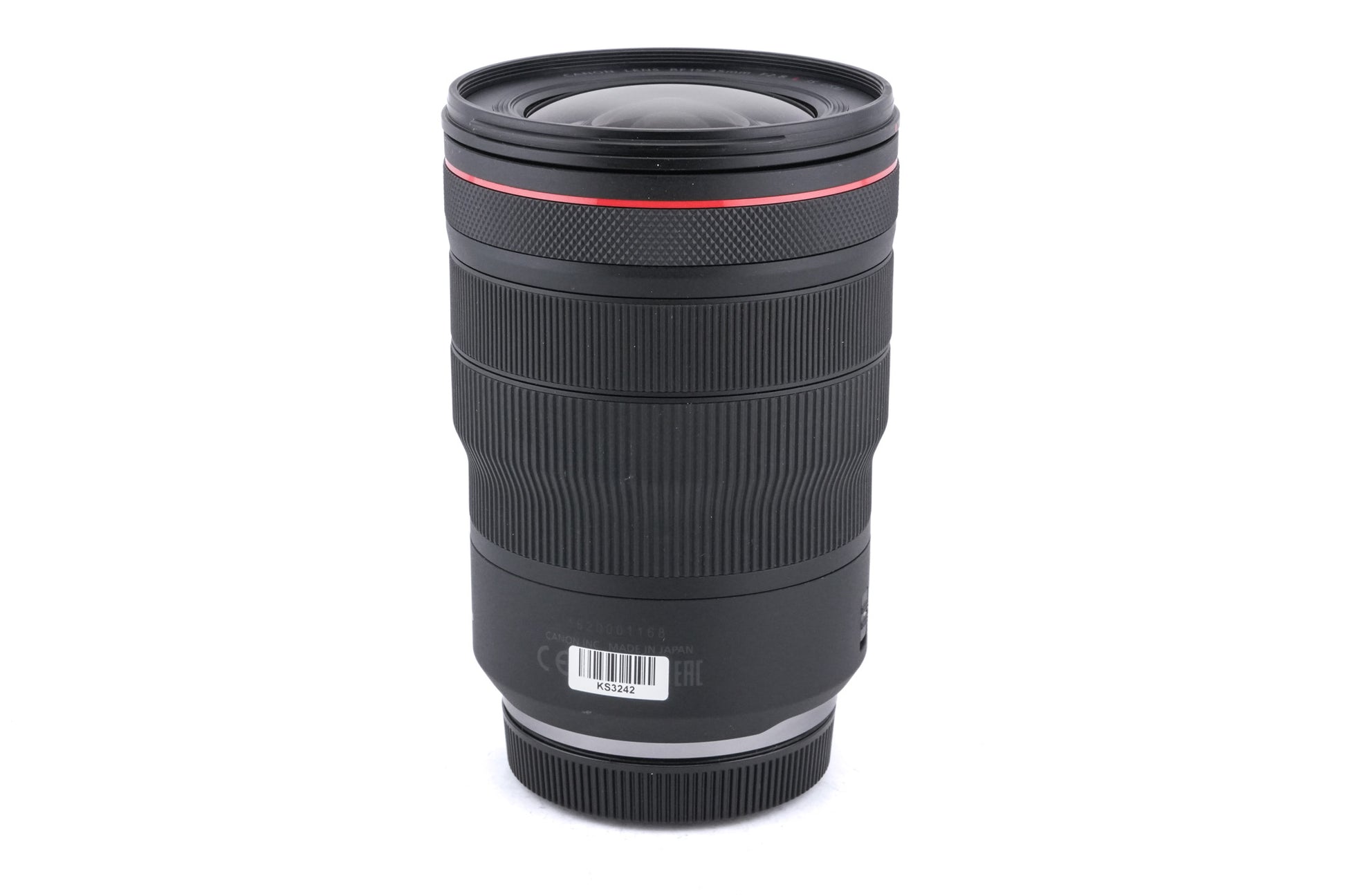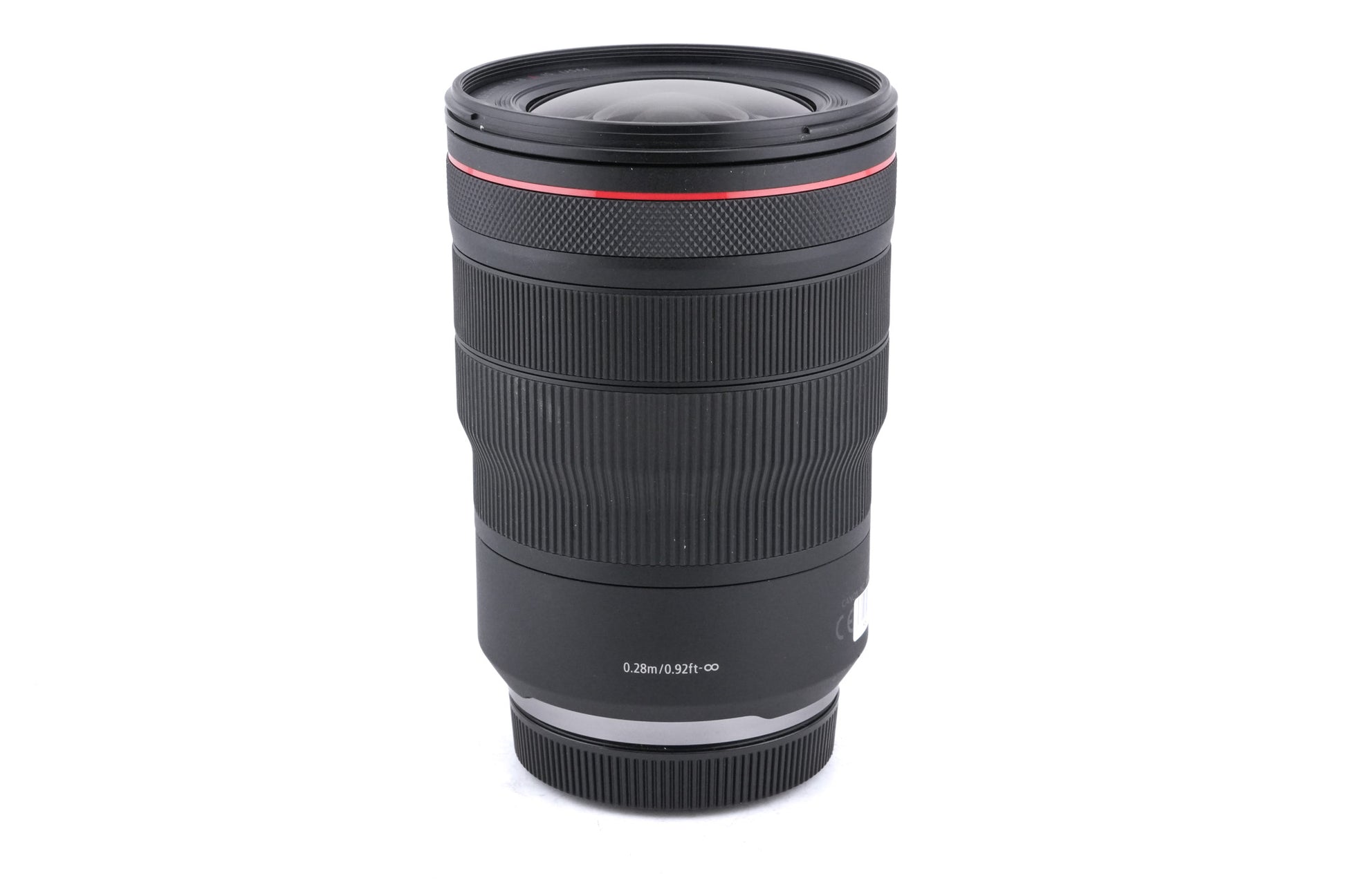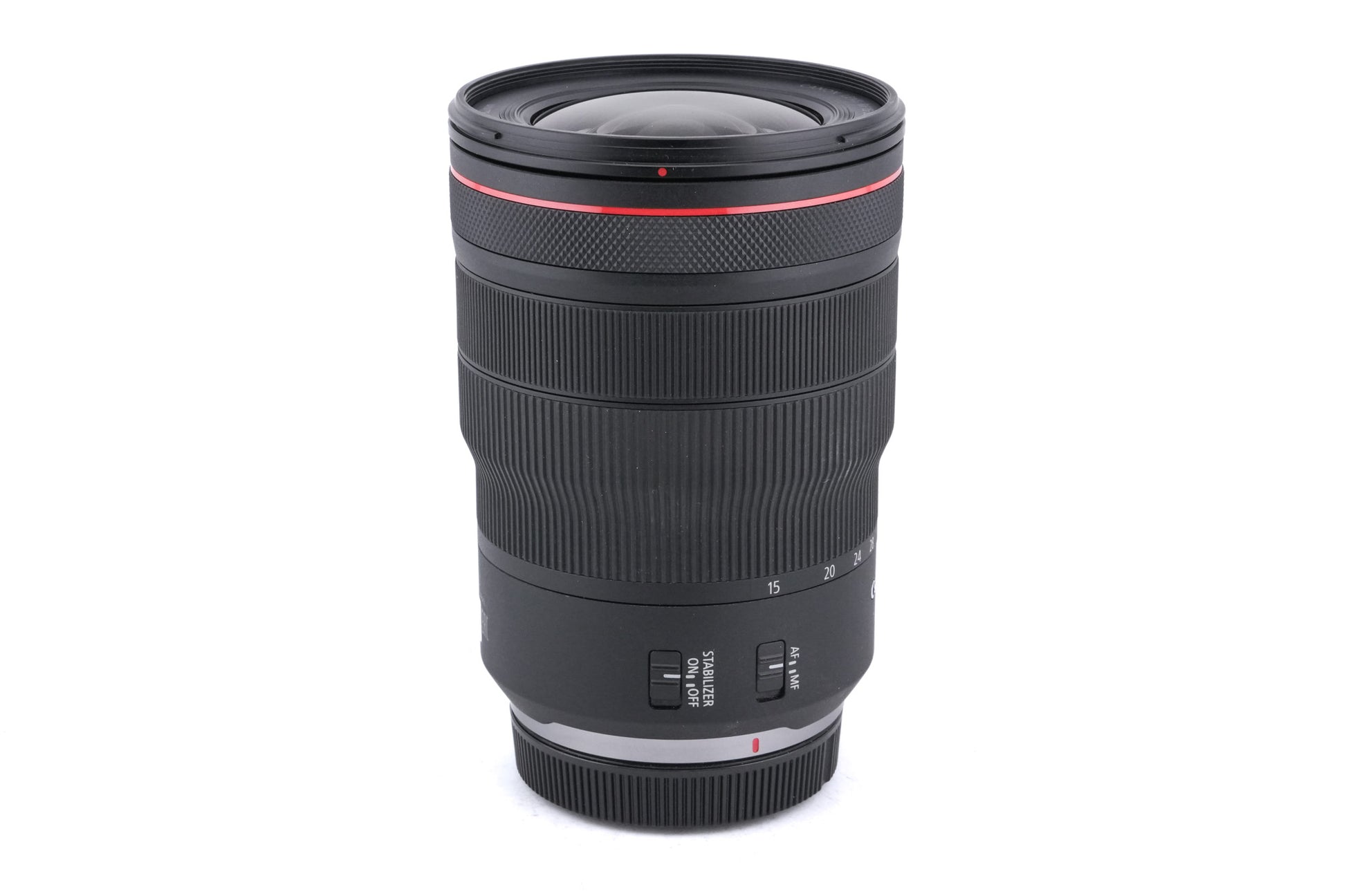 Autofocus wide-angle zoom lens made for RF mount digital mirrorless cameras by Canon. It's part of their L series of professional lenses. It has image stabilization (IS) and uses an ultrasonic focusing motor (USM) for autofocus. Metal/plastic body available in black.