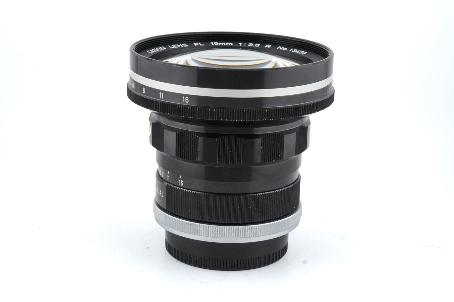 Manual focus super wide-angle lens made for FL-mount 35mm SLR cameras by Canon starting in 1965. It is a retrofocus type with a 96° angle of view and, unlike previous Canon 19mm lenses, did not require the user to lock up the mirror of their SLR. The original price (65000 Yen) is the equivalent of around 1300 Euros in 2025. Metal body available in black.