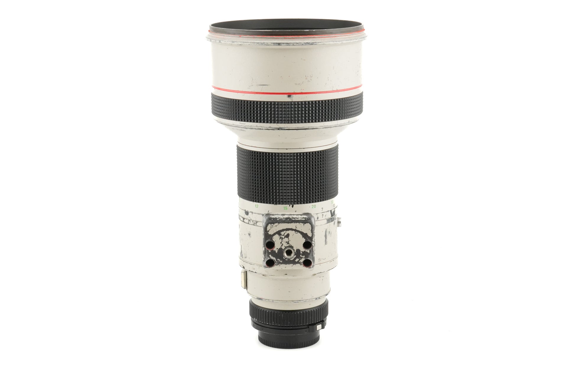 Manual focus fast long telephoto prime lens for FD mount SLR cameras released by Canon in 1981. Part of the top-of-the-line L series. This is the latest design which used the new mounting system and utilized both UD glass and fluorite crystals, artificially grown to suitable sizes (for use in photographic lenses), to minimize secondary spectrum aberrations. Metal body in white finish with black leatherette and a red stripe.
