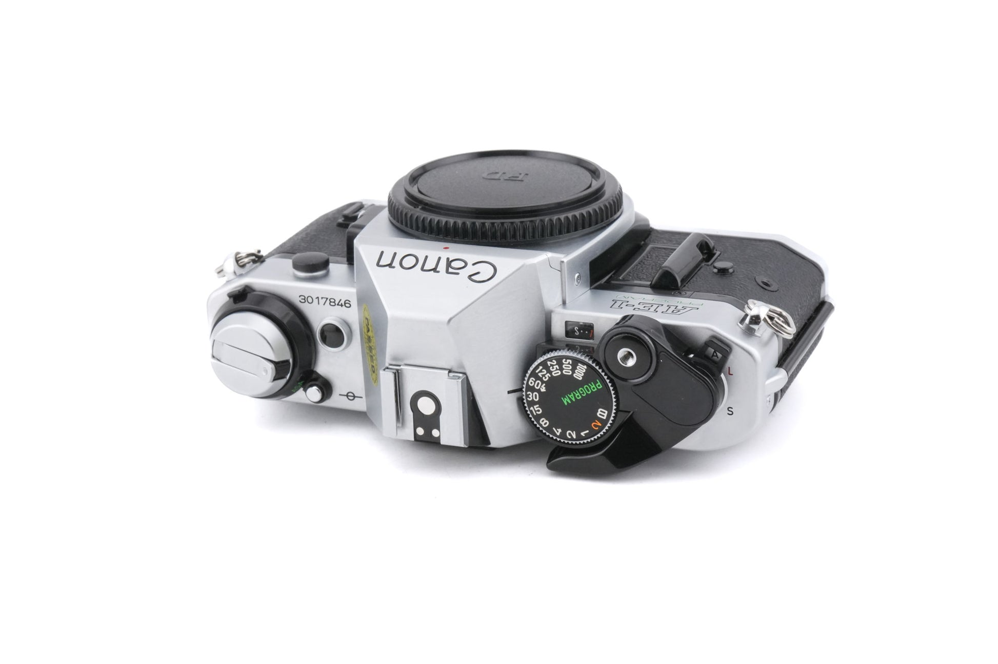 Manual focus FD-mount 35mm SLR released by Canon in 1981. The camera’s main advantage over the AE-1 is access to full program mode. In this mode, the camera will set both aperture and shutter speed automatically based on the lighting condition. The original price (60,000 Yen) is the equivalent of around 525 Euros in 2023. Metal body available in black & silver.