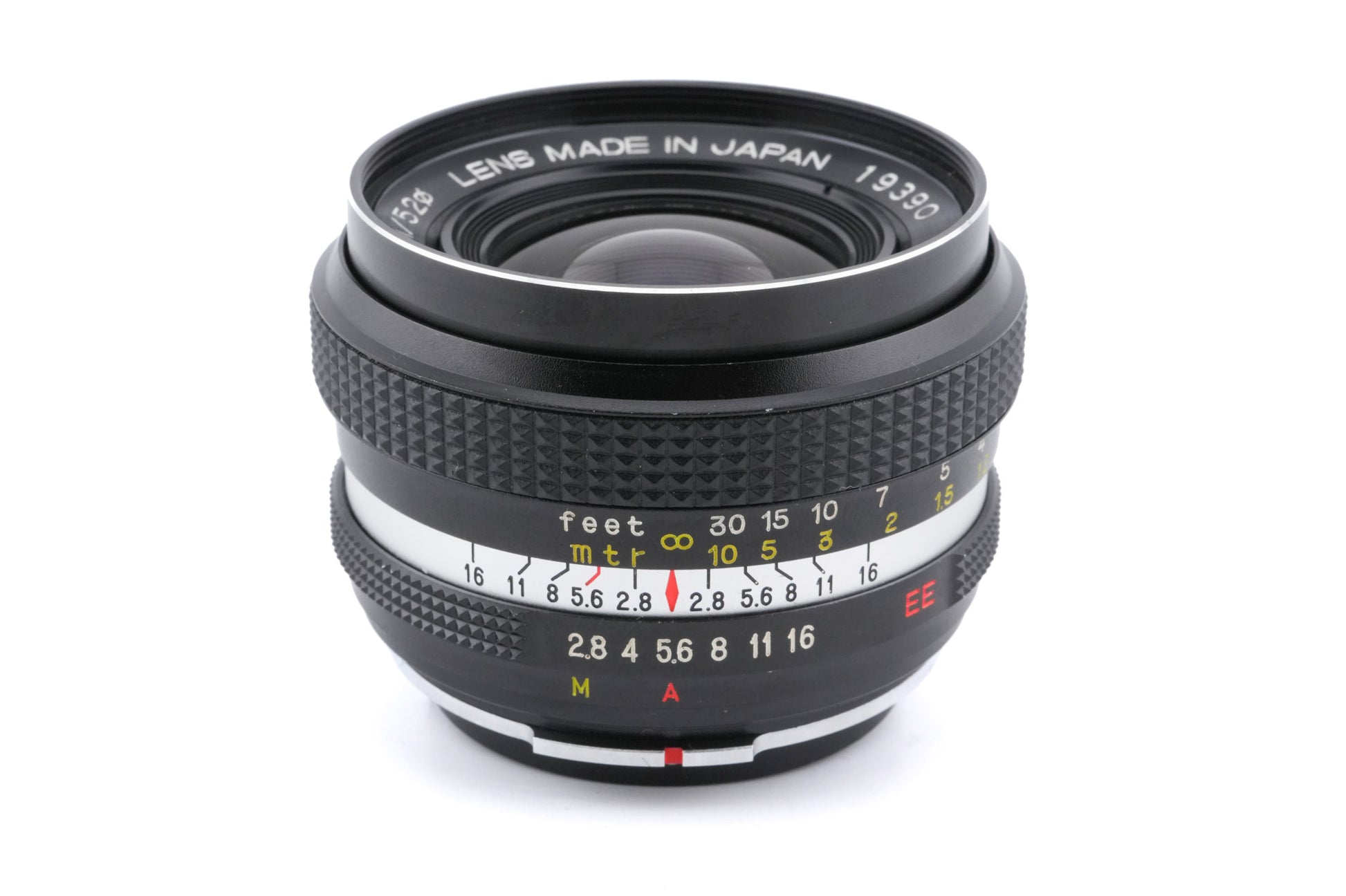 Manual focus wide angle lens made for Petri Bayonet mount SLRs by Carenar. Metal body available in black.