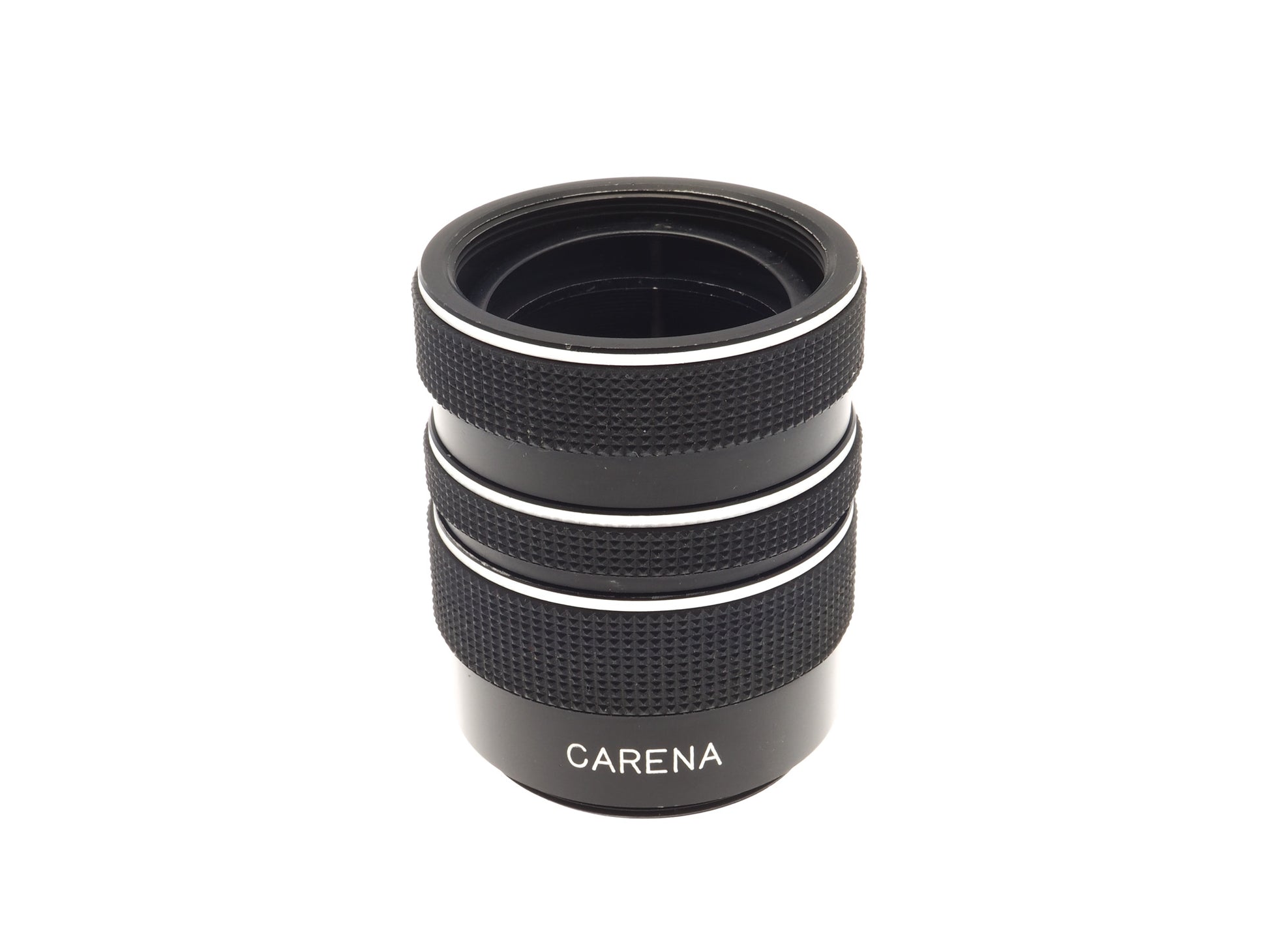 Set of extension tubes made for M42 screw mount 35mm SLR cameras introduced by Carena. It consists of three tubes: 11mm , 19mm, and 29mm. They have an aperture stop-down pin. Metal body available in black.