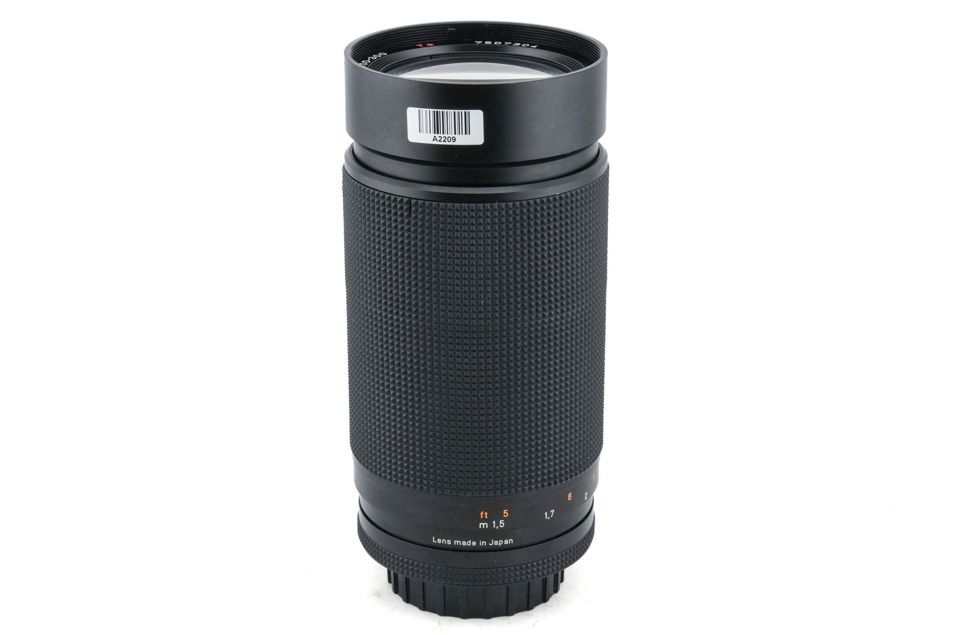 Manual focus telephoto push/pull zoom lens made for Contax/Yashica mount 35mm SLR cameras introduced by Carl Zeiss in 1994. This lens is of the newer MM variant that supports shutter priority and program modes. Metal body available in black.