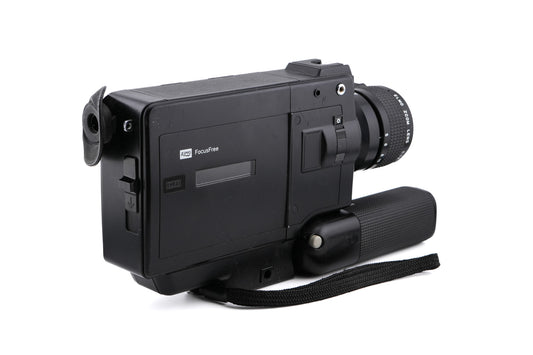 Manual focus Super 8 handheld video camera made by Elmo in 1980. Uses Kodak Supermatic 60m cassettes to capture footage with and without sound. Plastic/metal construction available in black.