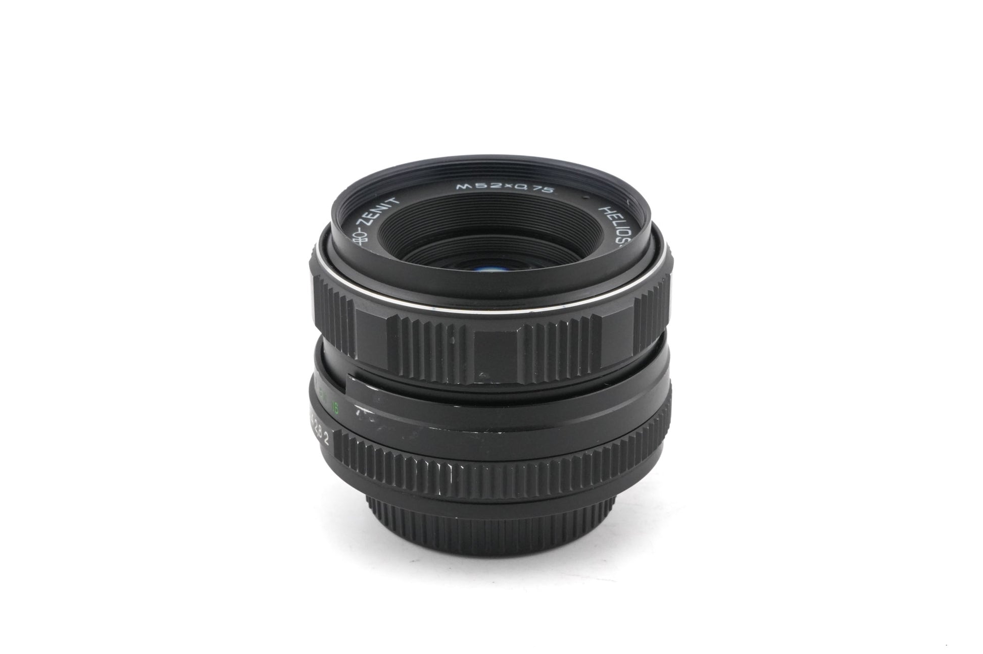 Manual focus normal lens made for M42 mount 35mm SLR cameras in the Soviet Union. Produced as the standard lens for many Soviet SLRs, including Zenits, and produced by many Soviet factories, including KMZ, Zenit, and Valdai. Based on the Carl Zeiss 58mm f2 Biotar. This version lacks an automatic/manual aperture switch. Metal body available in black.