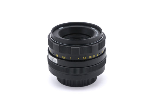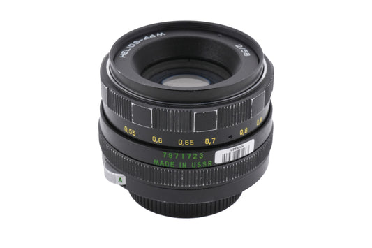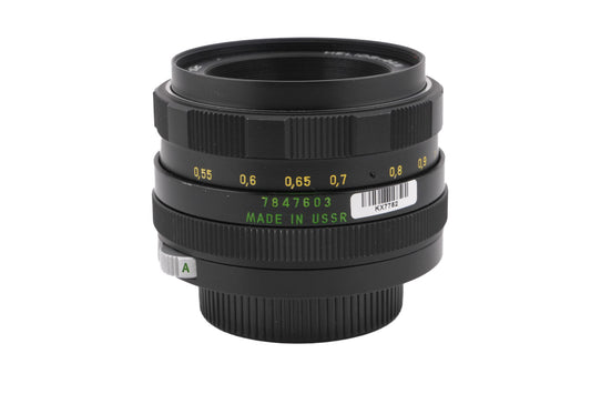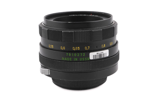 Manual focus normal lens made for M42 mount SLR cameras in the Soviet Union. Many factories made Helios lenses, including KMZ and Valdai. Metal body available in black.