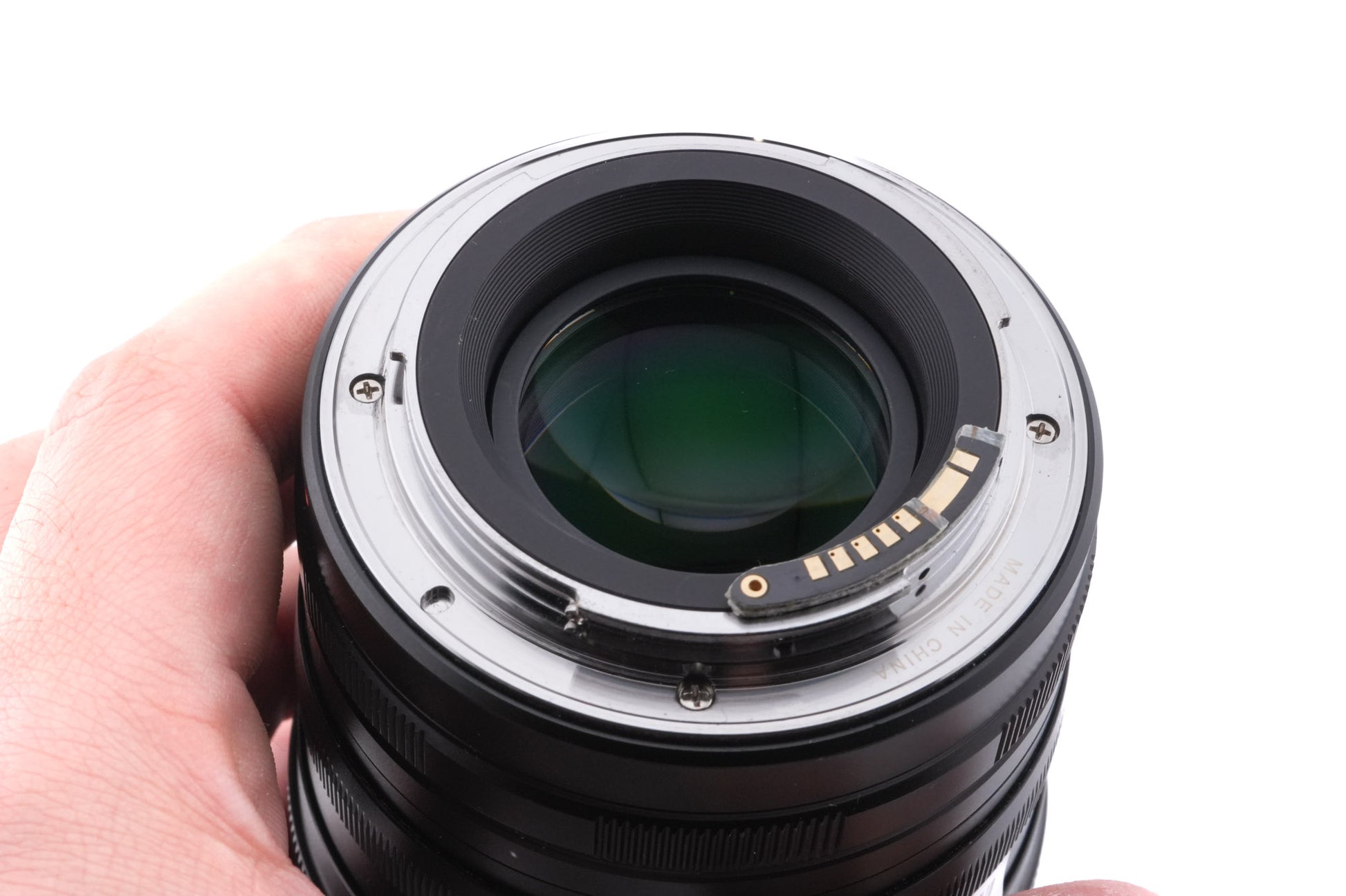 Manual focus telephoto lens made for Canon EF mount SLRs by Laowa. It has a Smooth Trans Focus (STF) mechanism that allows the lens to be used with T stops and a clickless aperture. It also has an apodization element that softens and darkens the edges of the frame to create a more pleasing bokeh. There are no electronic contacts with the body, so aperture and focus must be set manually. Metal body available in black.