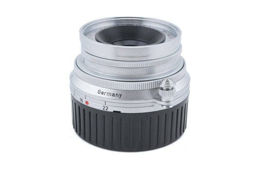 Manual focus wide normal lens made for M-mount rangefinder cameras introduced by Leica in 1954. This was the first version of the lens, and was designed for the M3. It required the SBLOO (12010) brightline viewfinder for composing. Metal body available in silver (SOONC-M / 11105).