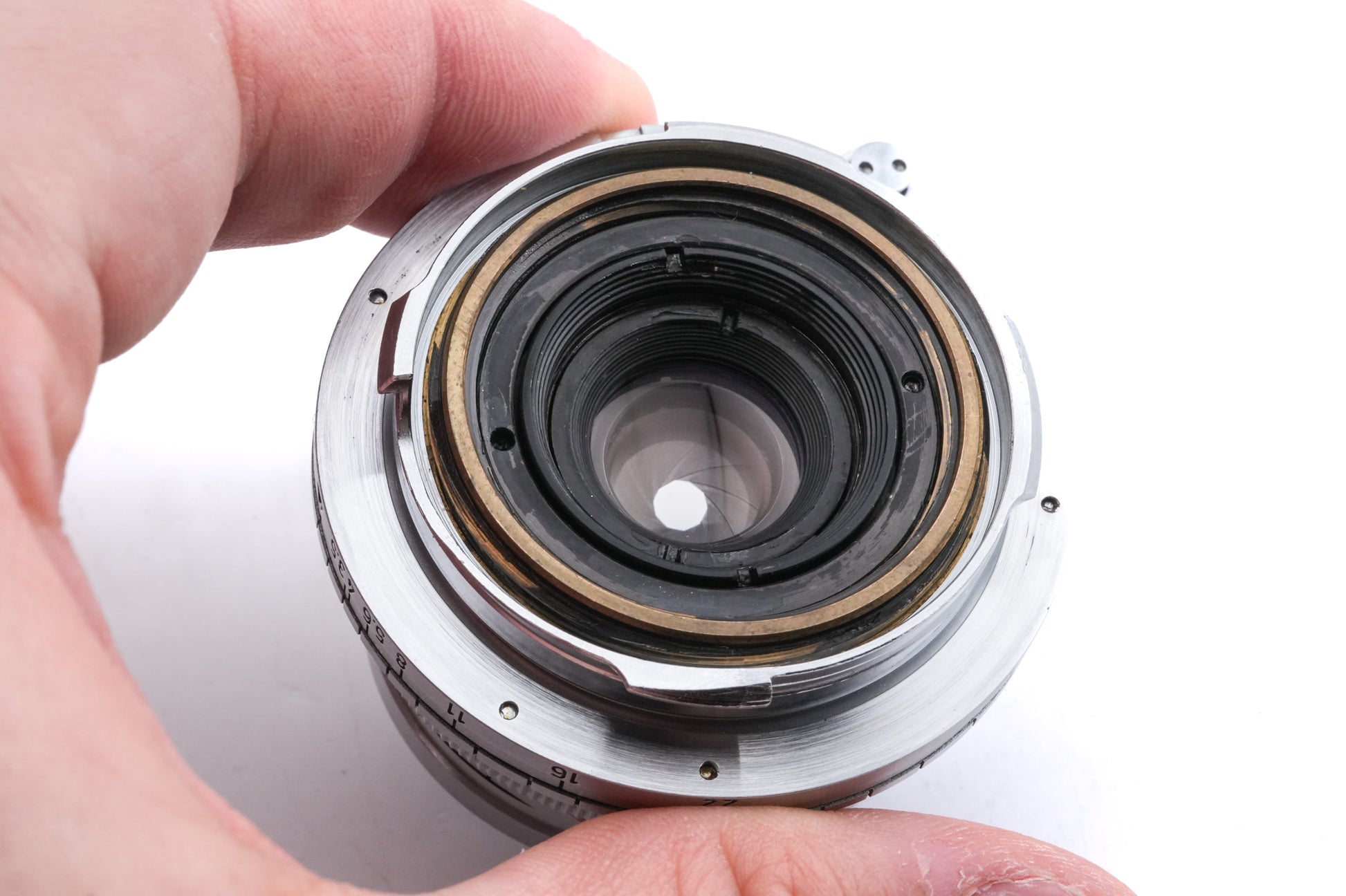 Manual focus wide normal lens made for M-mount rangefinder cameras introduced by Leica in 1954. This was the first version of the lens, and was designed for the M3. It required the SBLOO (12010) brightline viewfinder for composing. Metal body available in silver (SOONC-M / 11105).