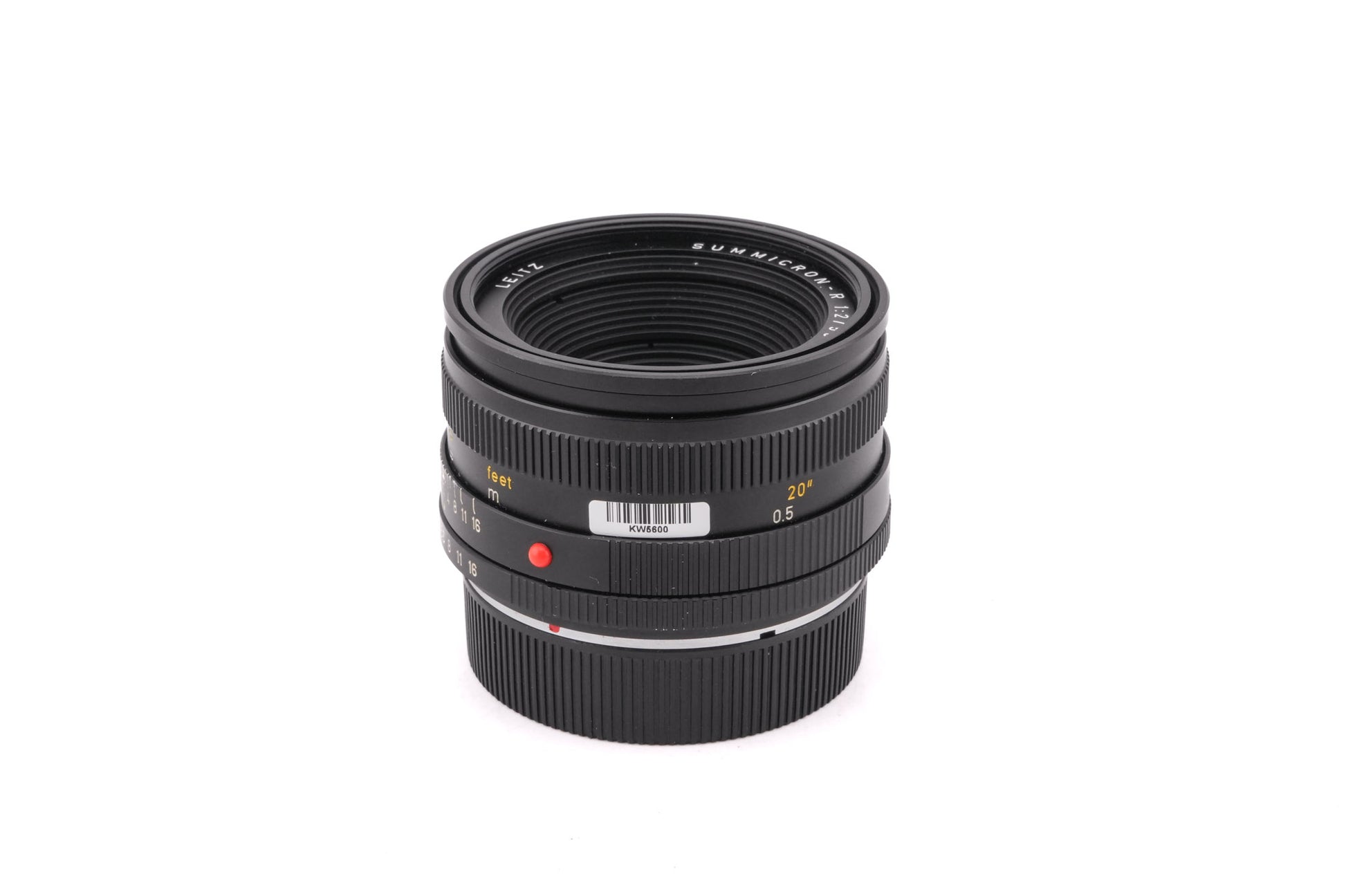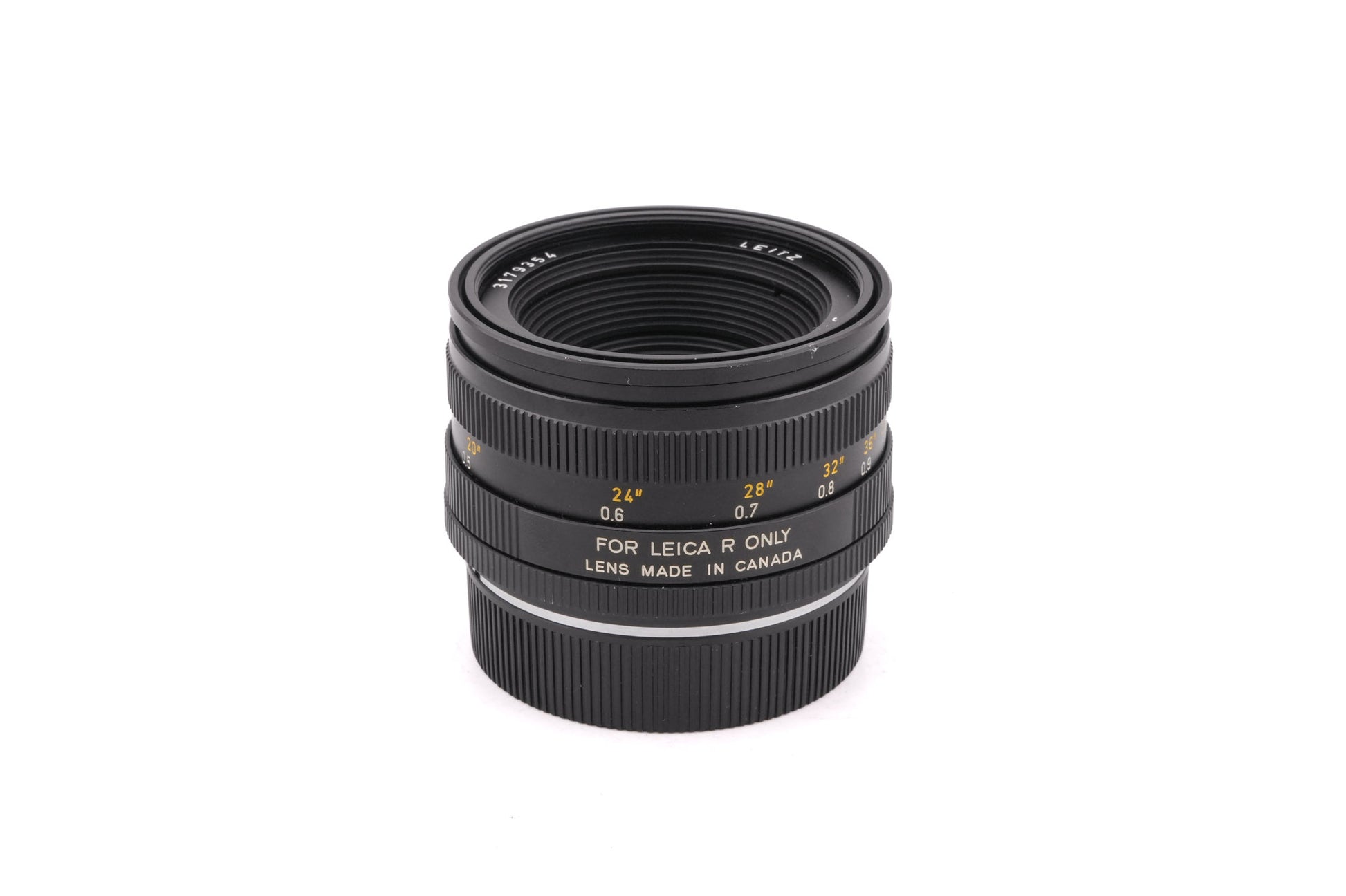 Manual focus normal lens made for R-mount 35mm SLR cameras introduced by Leica in 1976. This is the second version of the lens and was produced by Leitz Canada. It changed the optical formula and features higher contrast and improved flatness of the field. The design of the body changed and now incorporates a built-in lens hood and uses E55 filters instead of the older Series VI. This lens has a 3rd Cam (R Cam) mount. 3rd Cam lenses only have the third stepped cam as seen on the 3-Cam version. They are compatible with R-series cameras only and will not fit the Leicaflex cameras. Metal body available in black (11216).