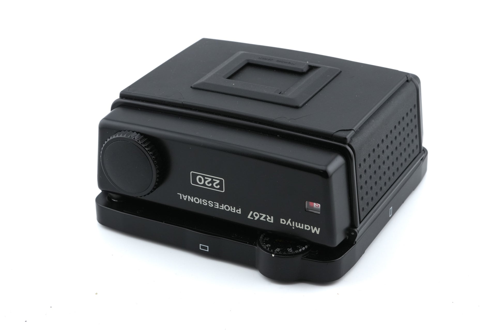 220 film back made by Mamiya for RZ67 SLR cameras. This is the second generation, with film memo and dark slide holder. Connects to the body electronically to communicate ISO information. Plastic and metal body available in black.