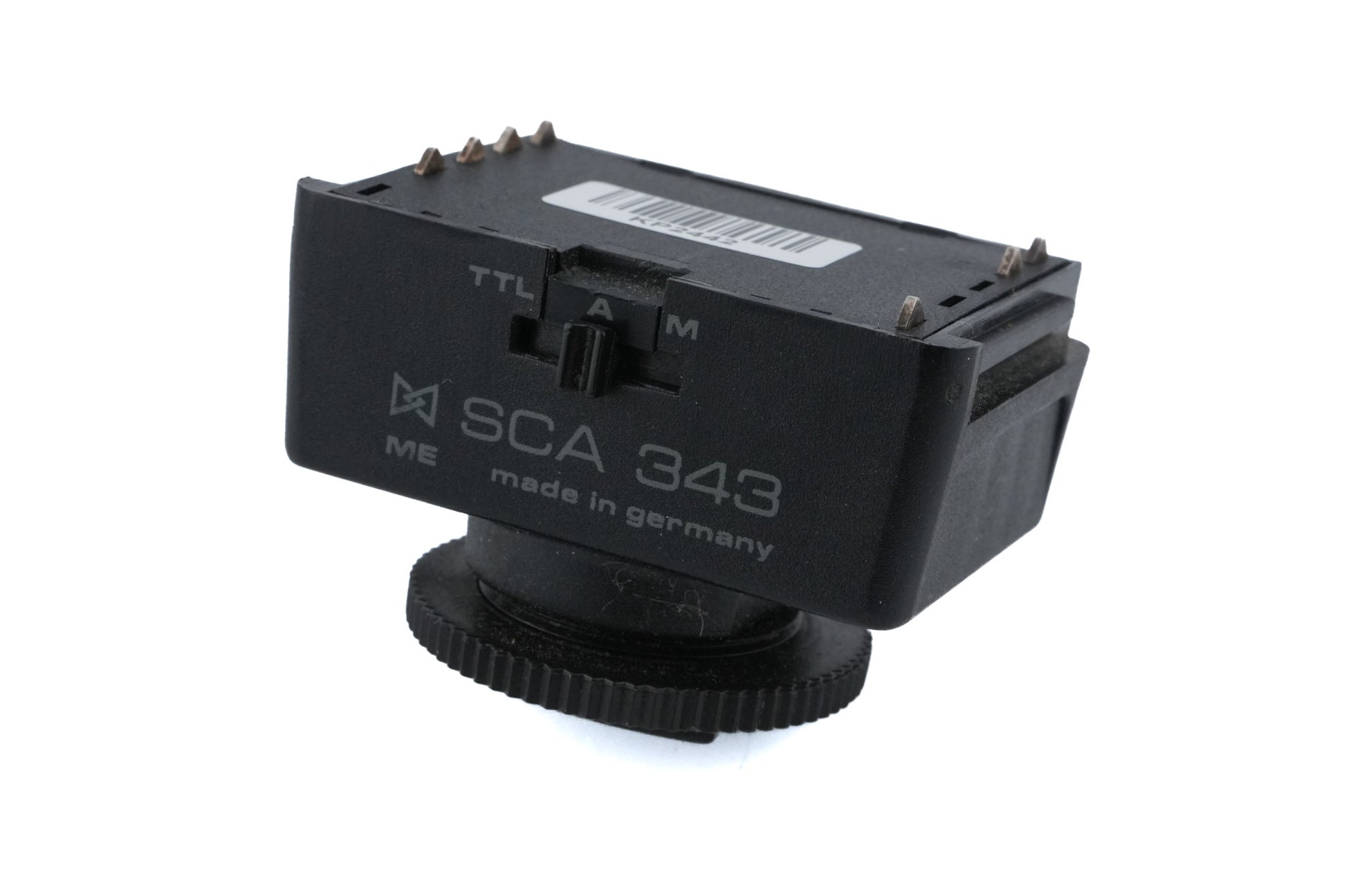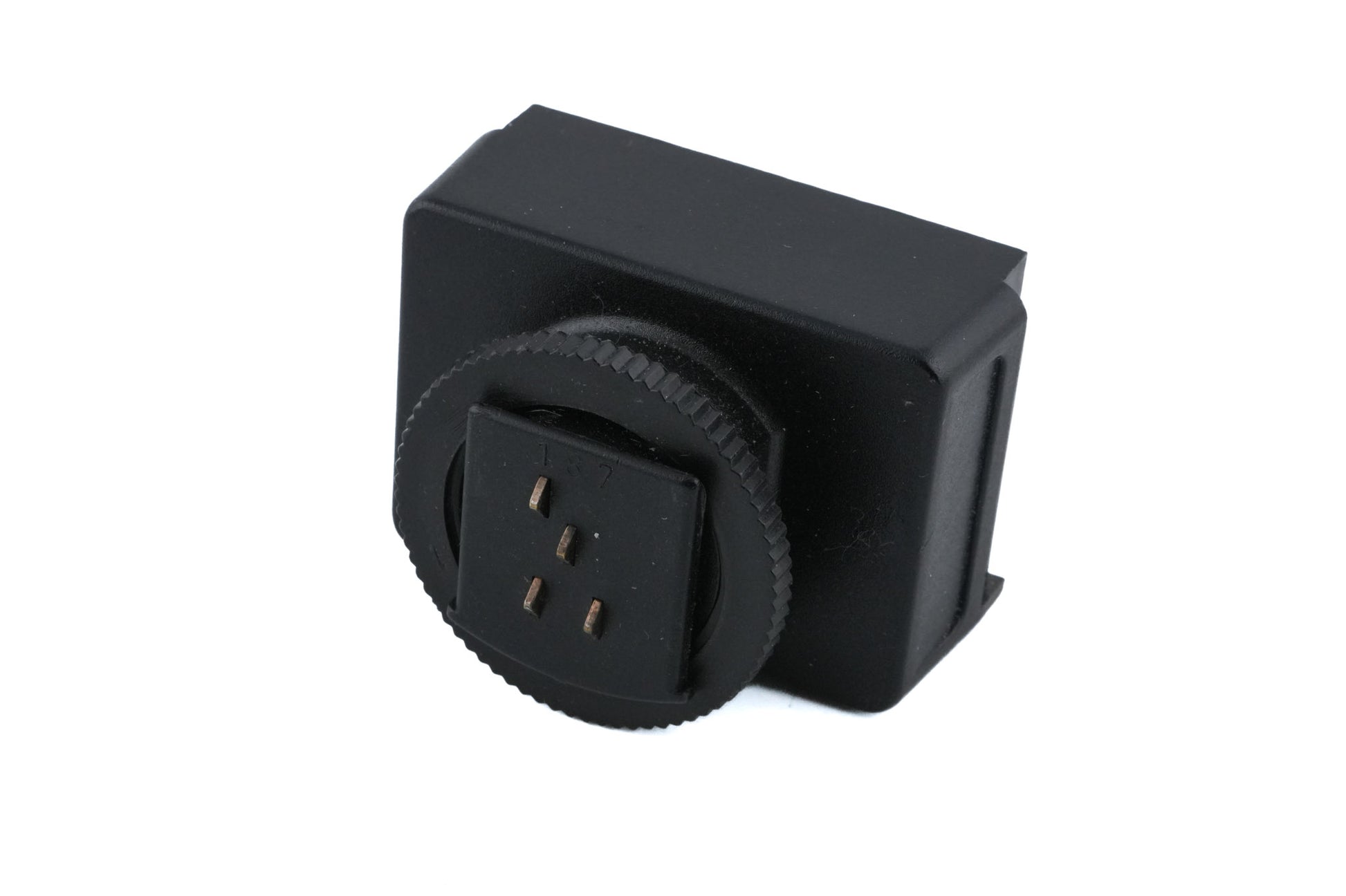 Flash adapter for Nikon F-mount 35mm SLR cameras. Can be used with SCA 300 system flashes.