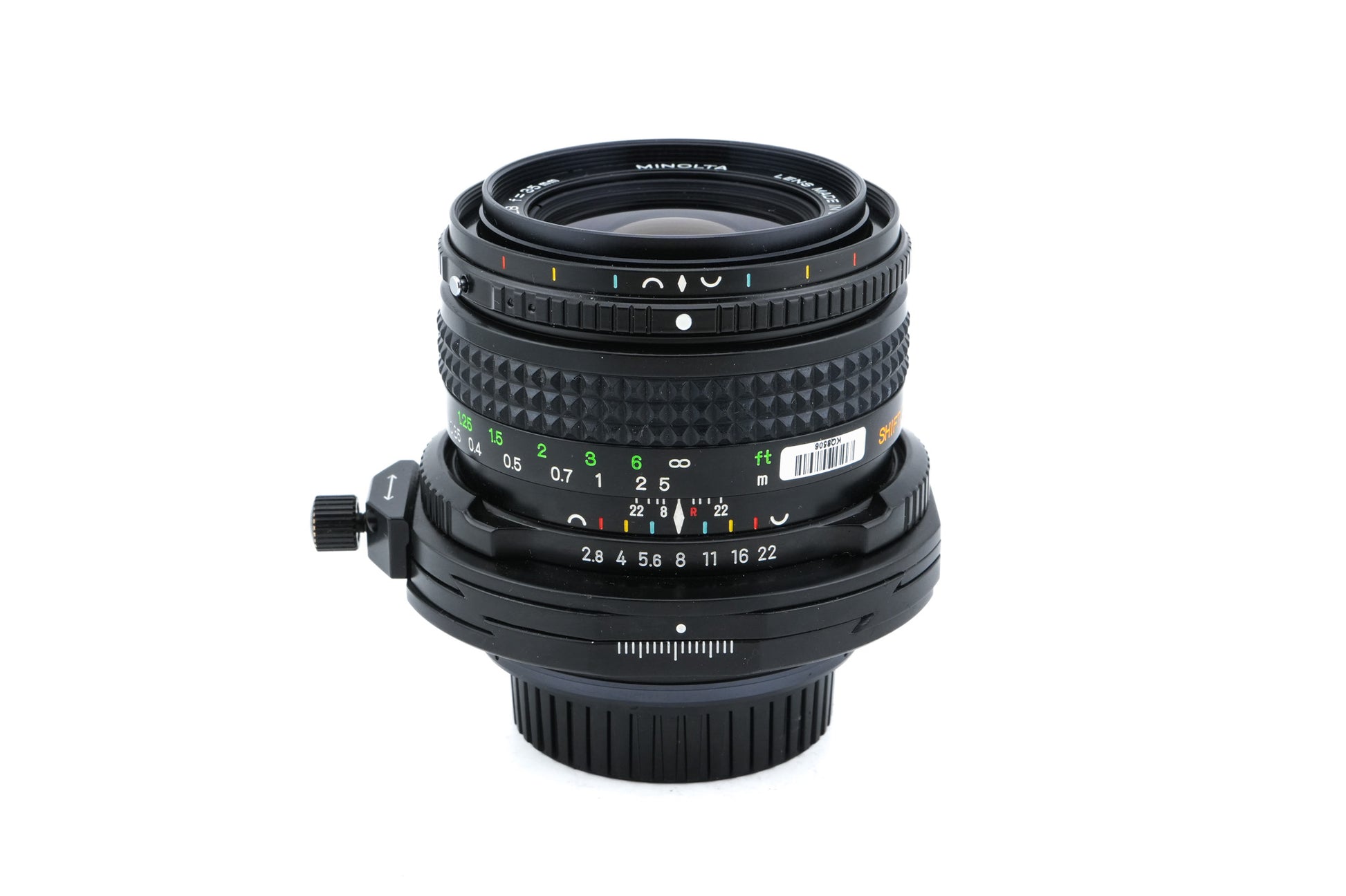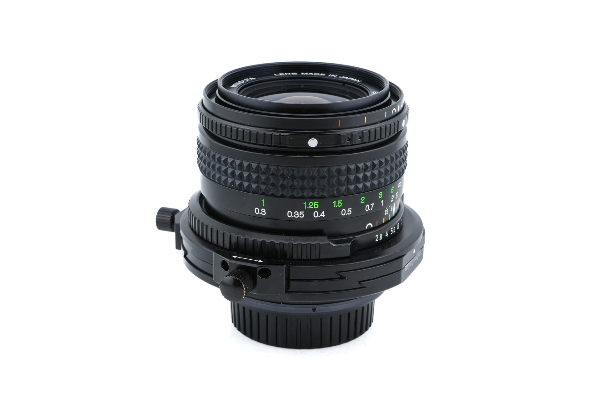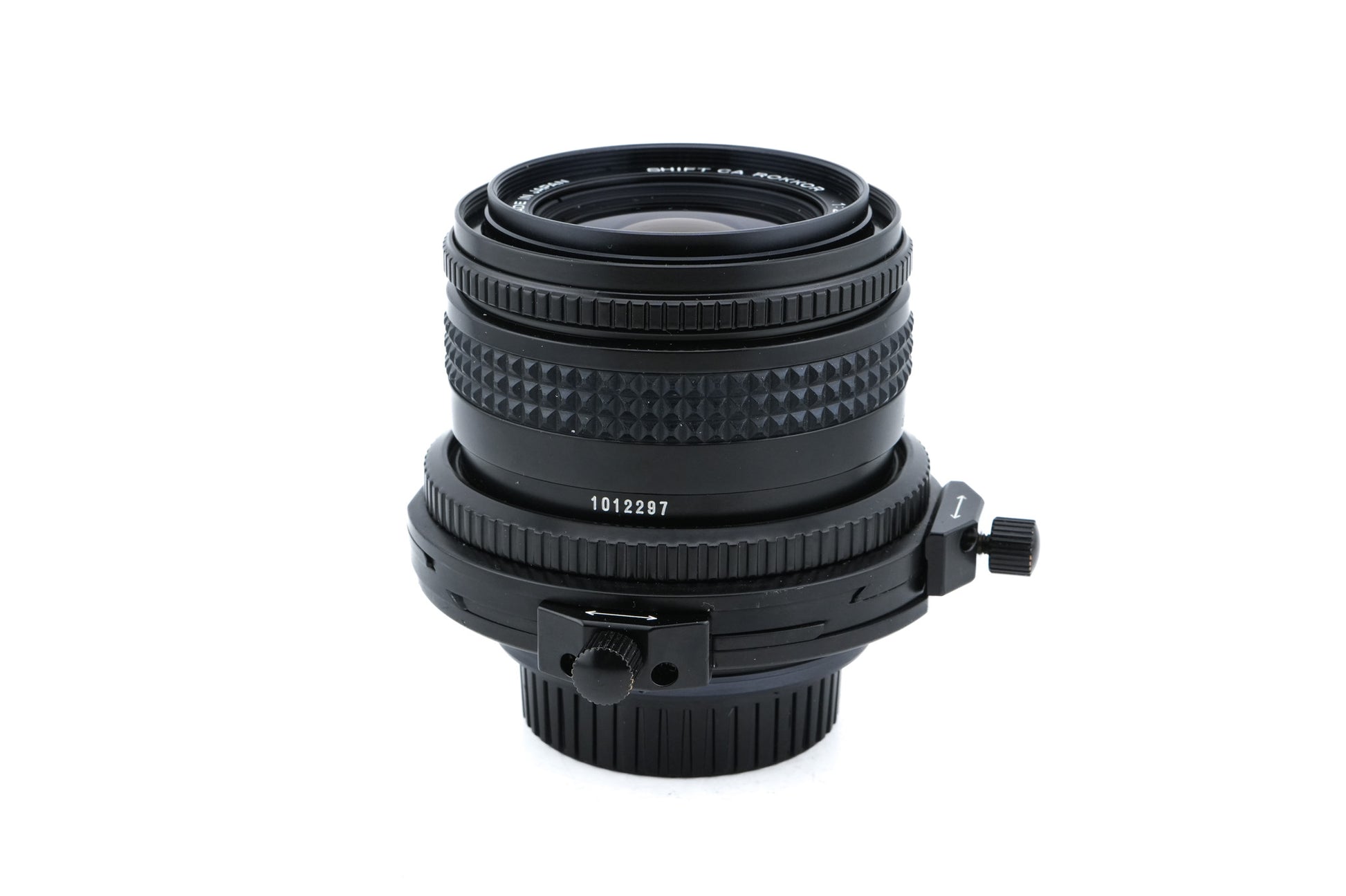 Manual focus wide normal shift lens made for MD/SR mount 35mm SLRs by Minolta. Like other shift lenses, it has no automatic aperture stop-down mechanism. Aside from shift functions, the lens has a variable field curvature (VFC) control that allows for further adjustment of the perspective and focal plane. Metal body available in black!