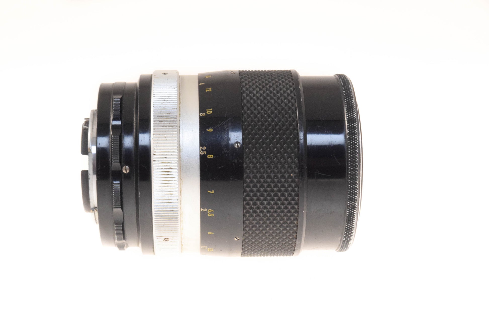 Manual focus telephoto prime lens made for F-mount 35mm SLR cameras by Nikon. This is an early version without the AI ridge, so it will only meter properly on older F and Nikkormat cameras that use the bunny ear metering prongs. Has a built-in lens hood. Metal body available in black & silver.