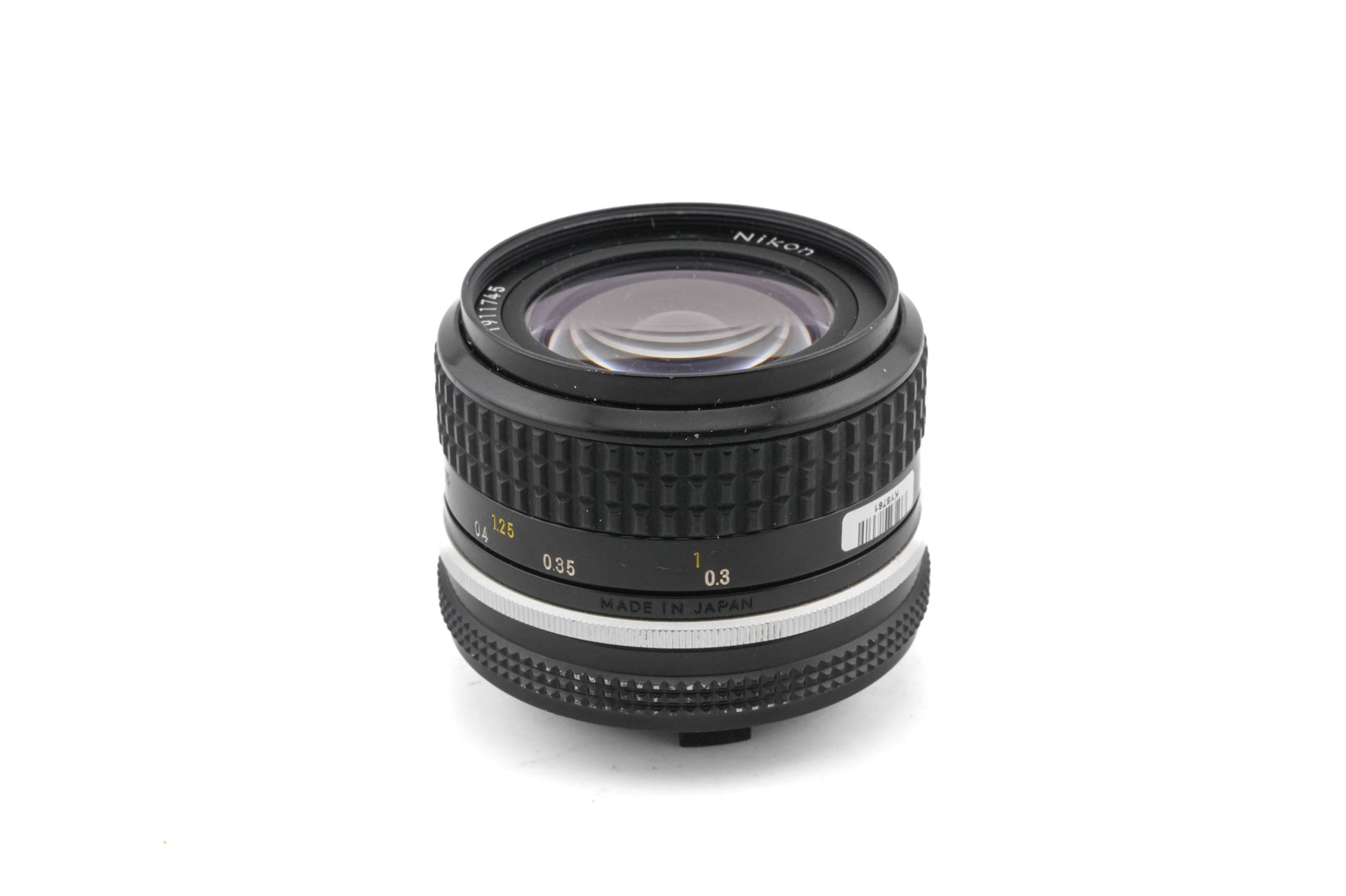 Manual focus wide-angle lens made for F-mount 35mm SLR camera introduced by Nikon starting in 1977. It has the bunny ear metering prongs and AI ridge but no AI-S indent, so it will meter properly on all manual Nikon cameras but will not work in the advanced program modes of later models. Metal body available in black.
