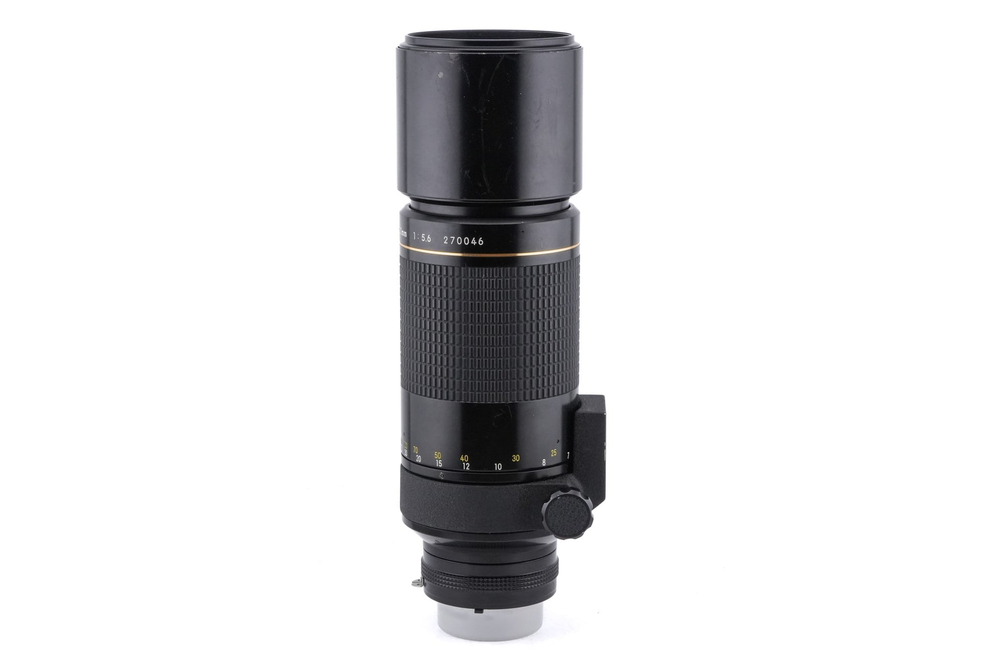 Manual focus telephoto lens made for F-mount 35mm SLR cameras introduced by Nikon in 1975. The optical construction consists of one extra-low dispersion (ED) glass element, which improves optical performance significantly when compared to the previous 400mm model. It has a built-in lens hood and tripod mount. Metal body available in black.
