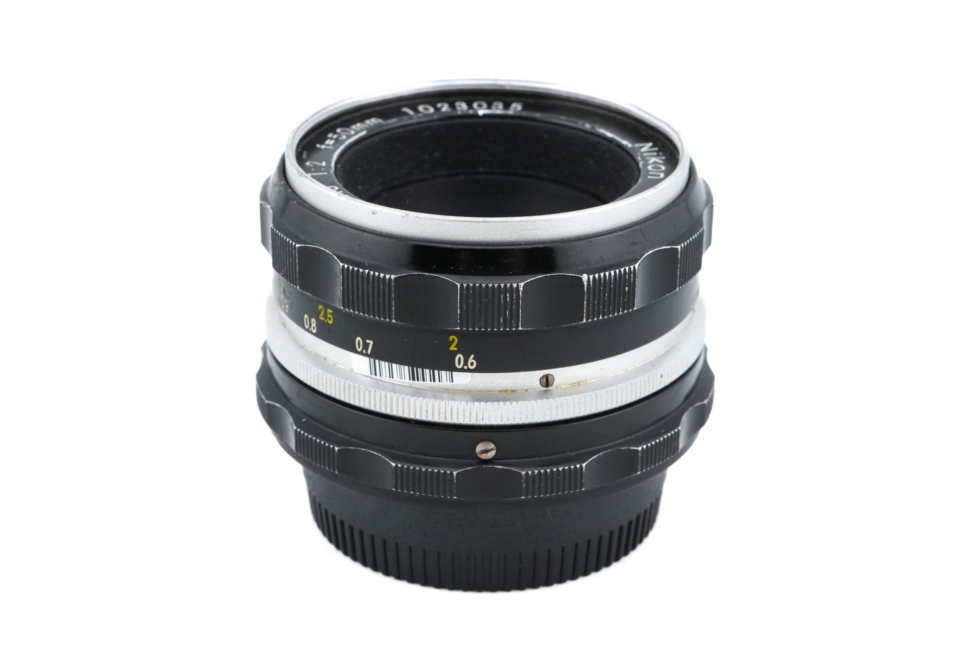 Manual focus normal lens made for F-mount SLR cameras by Nikon released in 1964. It has the bunny ear metering prongs but no AI ridge or AI-S indent so it will only meter on F, F2, and Nikkormat cameras and won't work with the advanced program modes of later cameras. Metal body available in black.