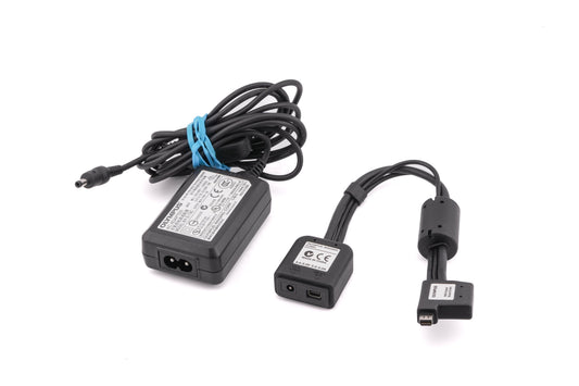 Power coupler made by Olympus. It allows Olympus digital cameras to be powered by an AC adapter through the USB port. It is used together with the Olympus E-7AU or D7AC AC Adapter to power the camera. It also has a USB data thru-put connection. Plastic body available in black.
