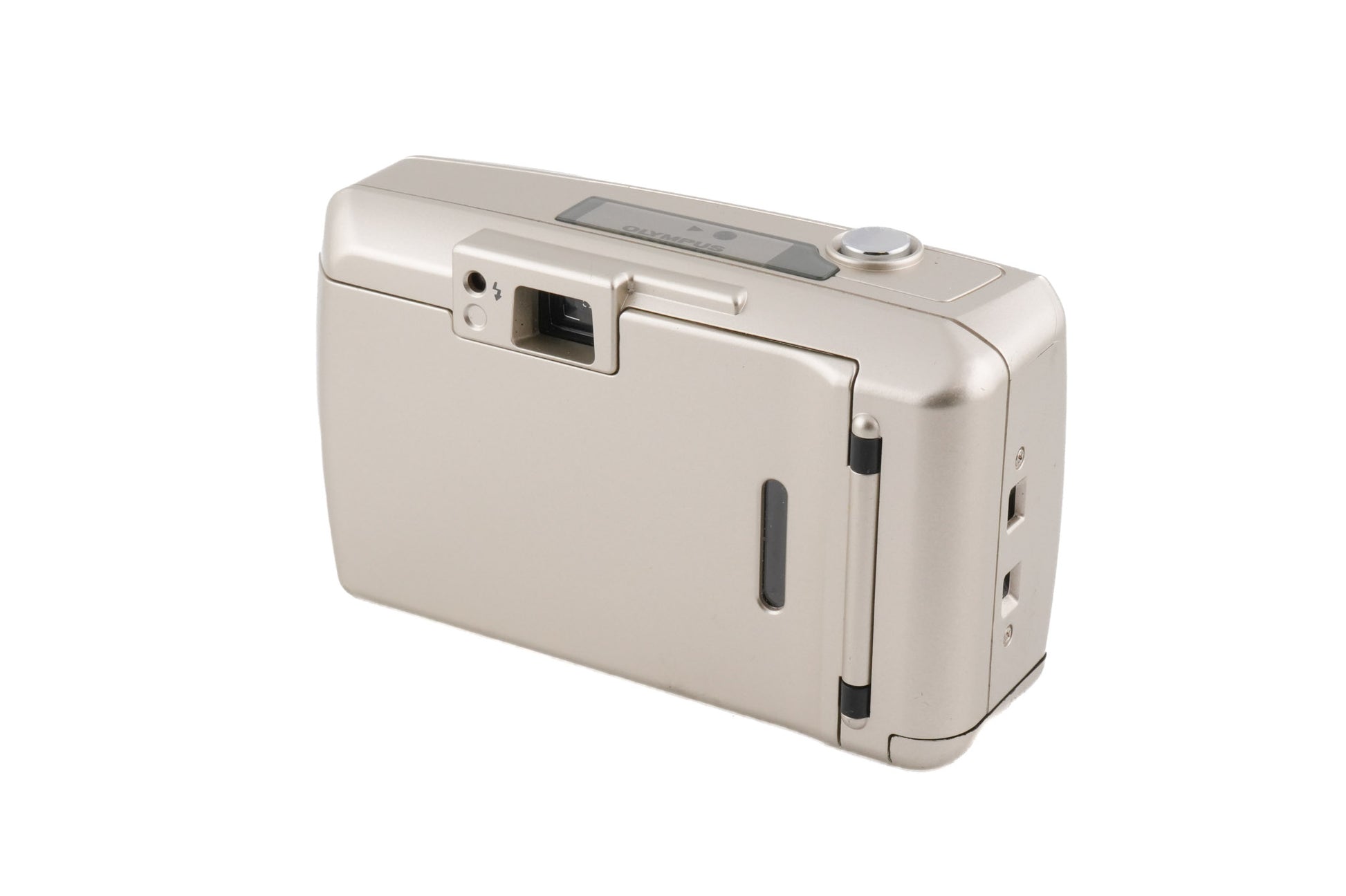 Autofocus 35mm point-and-shoot camera made by Olympus in 2002. Part of a legacy of Trip 35 cameras dating back to the 1960s. Plastic construction available in champagne.