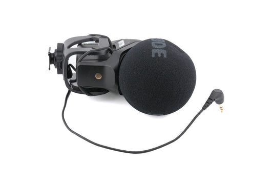 Stereo microphone made by Røde. It has a 75hz high-pass filter and +20db and -10db switches. It uses a 3.5mm audio jack. Plastic body available in black.