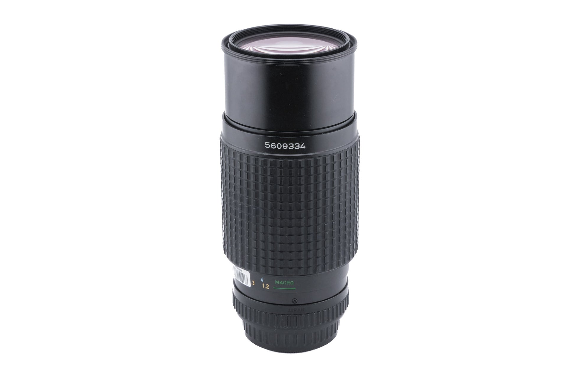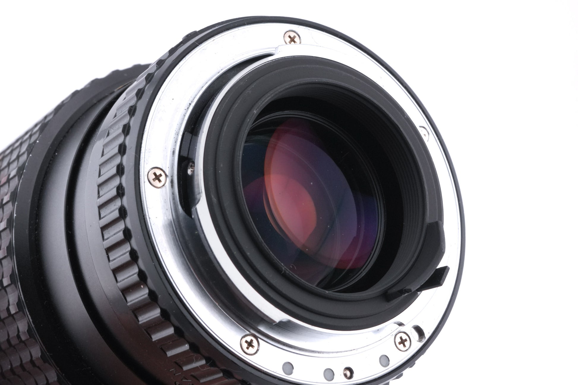 Manual focus telephoto push-pull zoom lens made for K-mount 35mm SLR cameras introduced by Pentax. It has a built-in lens hood. Metal body available in black.