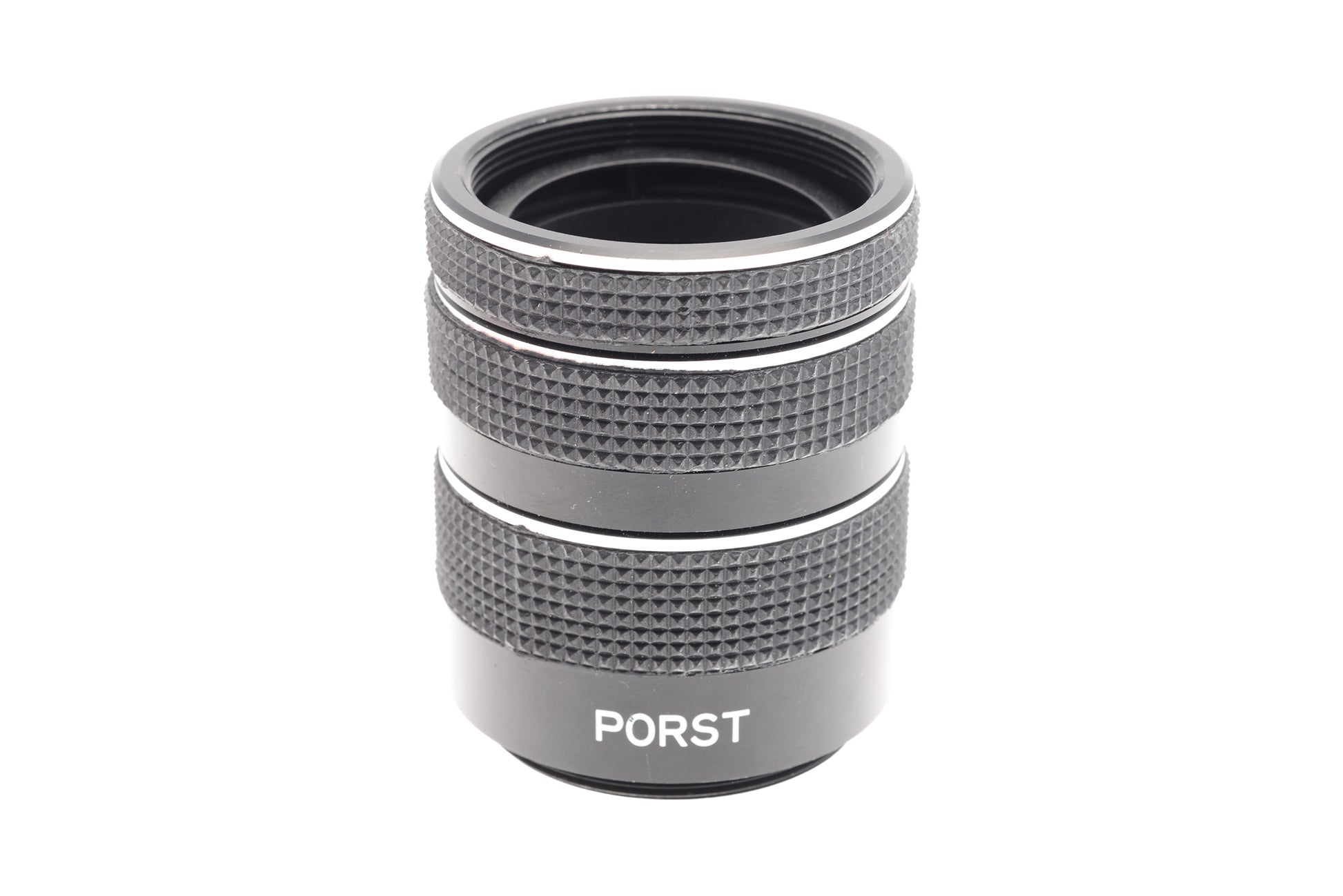 Three piece extension tube set for M42 thread mount cameras and lenses. The tubes provide an extension of 11mm, 19mm, and 29mm.