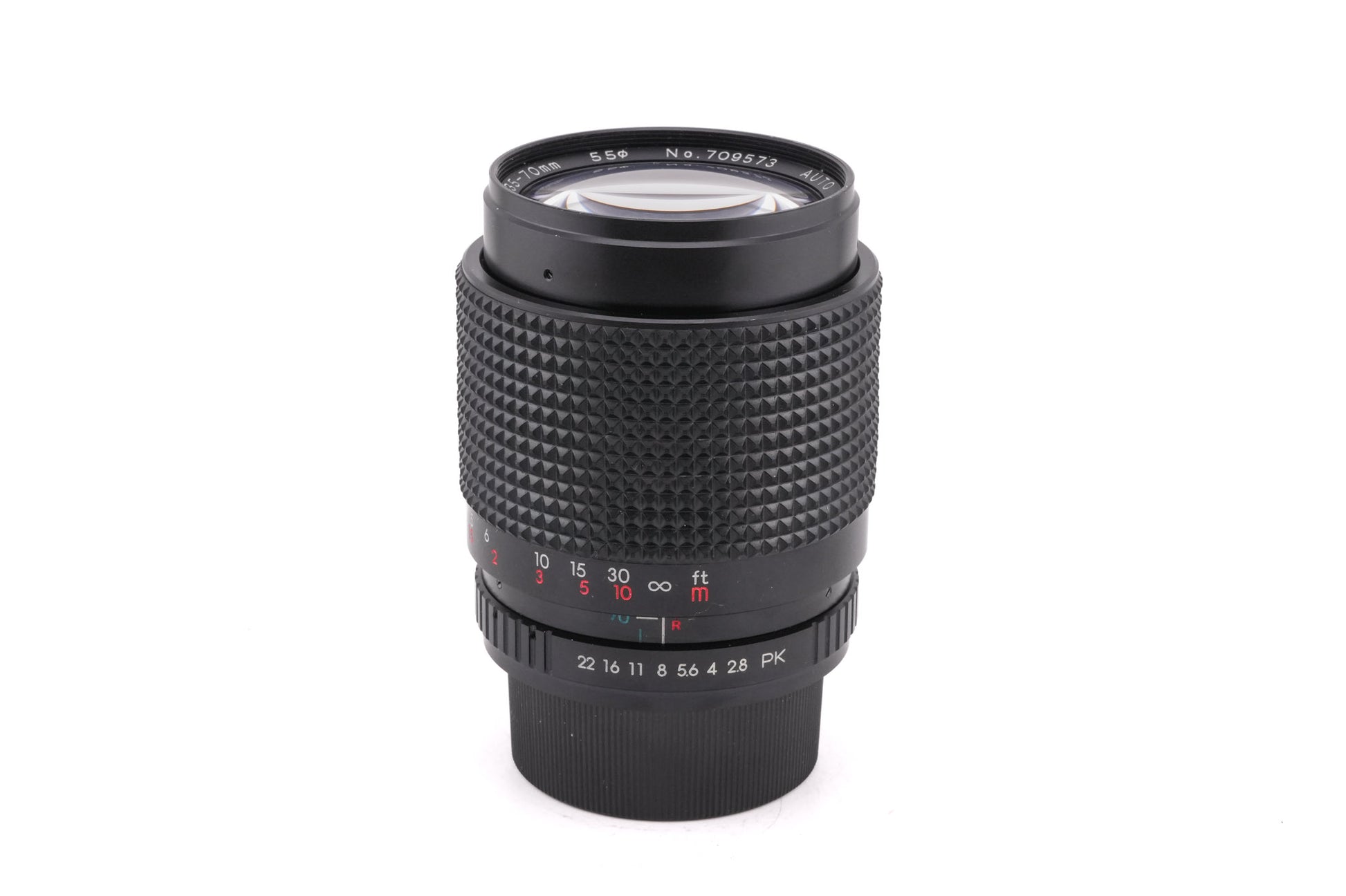 Manual focus zoom lens made for K-mount 35mm SLR cameras introduced by Revue. Metal body available in black.