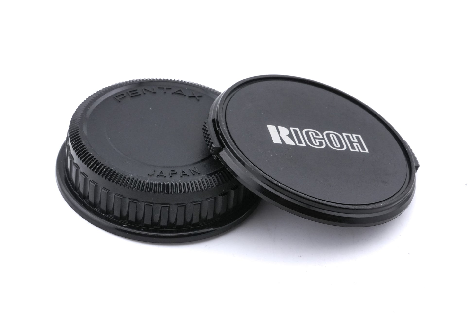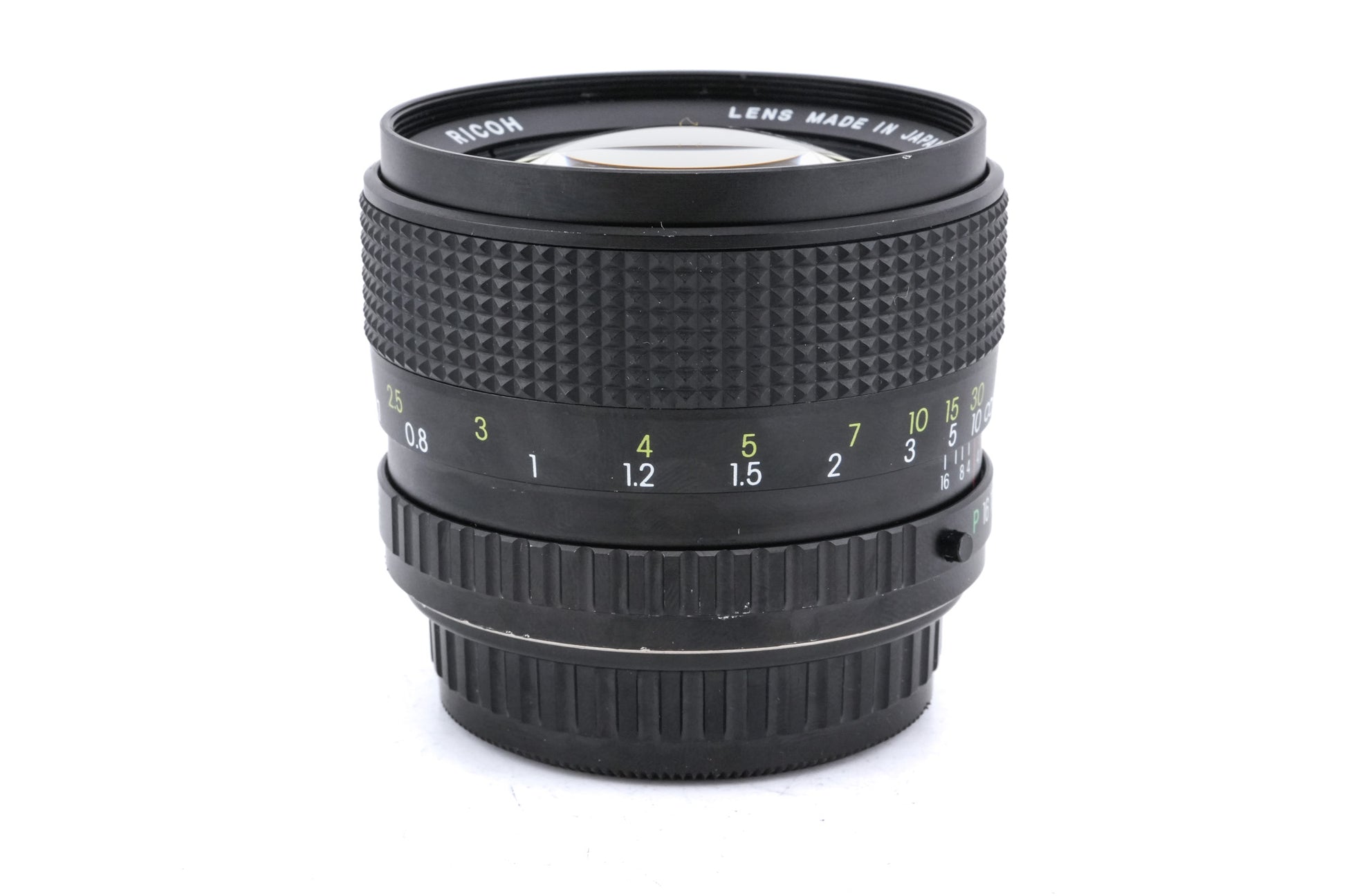 Manual focus normal lens made for Pentax K mount SLRs by Ricoh. This lens has the "Ricoh pin" on the bayonet so it won't work with the advanced program modes of later (KA) Pentax cameras and won't work at all on autofocus Pentax cameras. Metal body available in black.