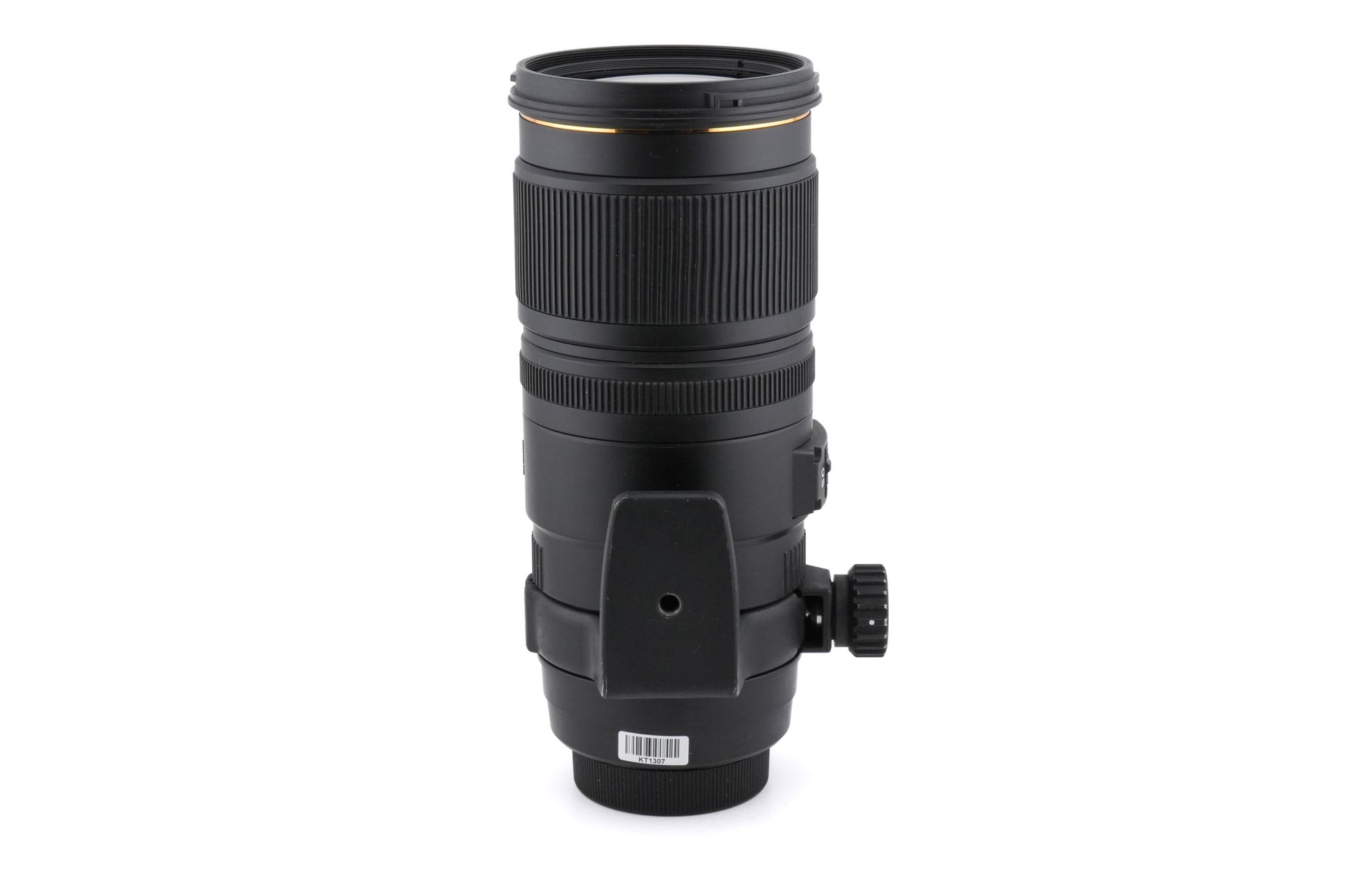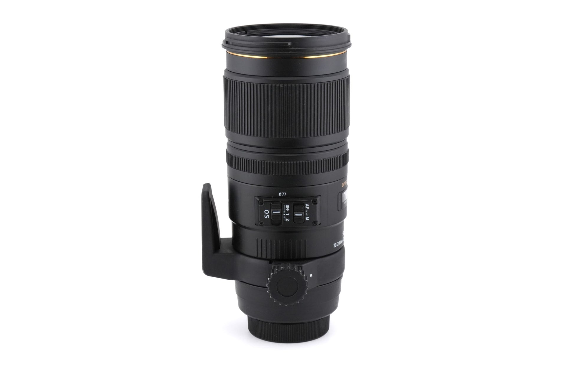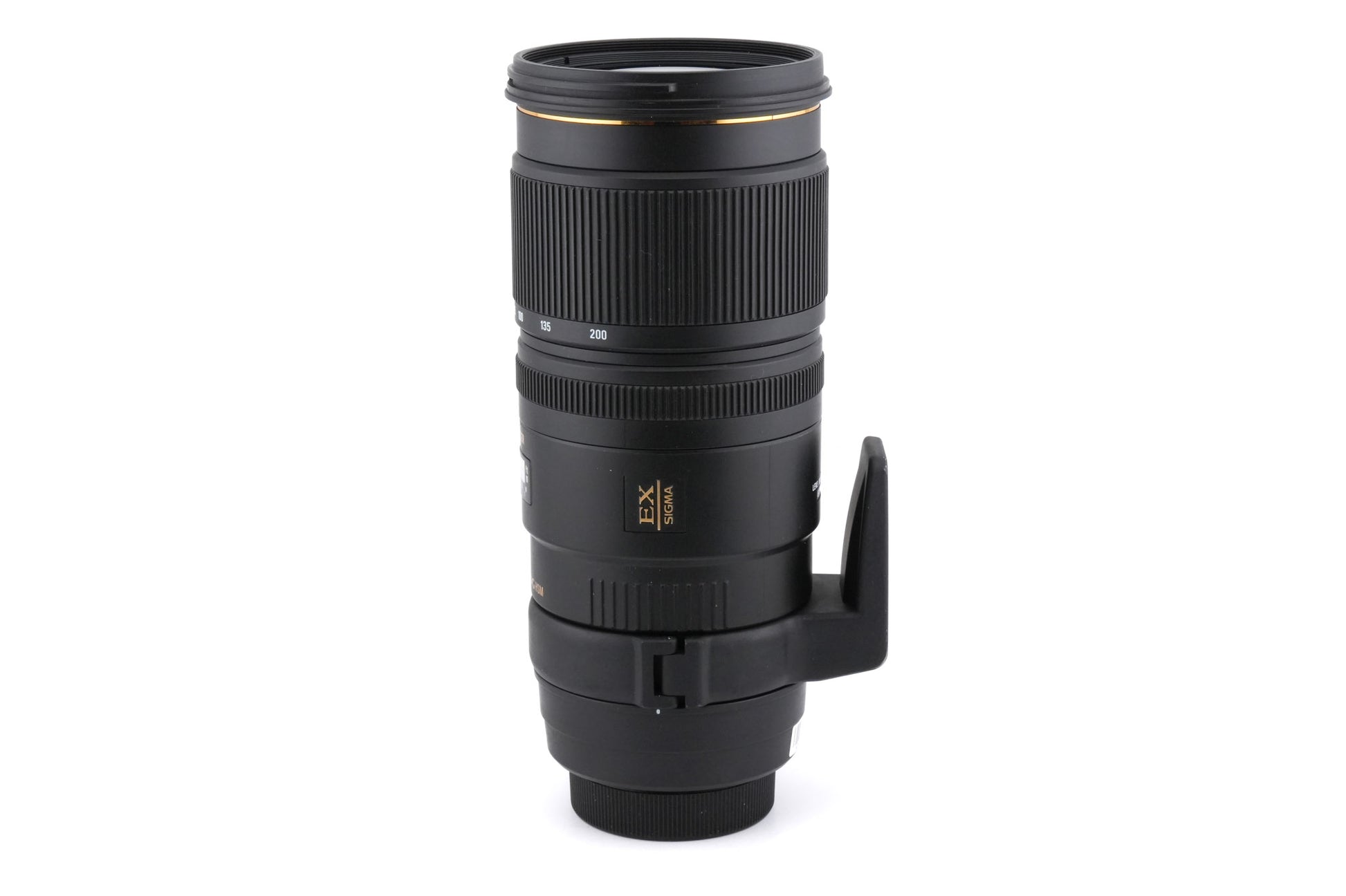 Autofocus telephoto zoom lens made for Nikon F mount by Sigma. This lens is not compatible with Nikon film cameras other than the F6. It uses apochromatic (APO) glass elements to improve image quality and has Sigma's Optical Stabilizer (OS) and High-Speed Motor (HSM) to improve focusing speed and lower camera shake. Metal/plastic body available in black.