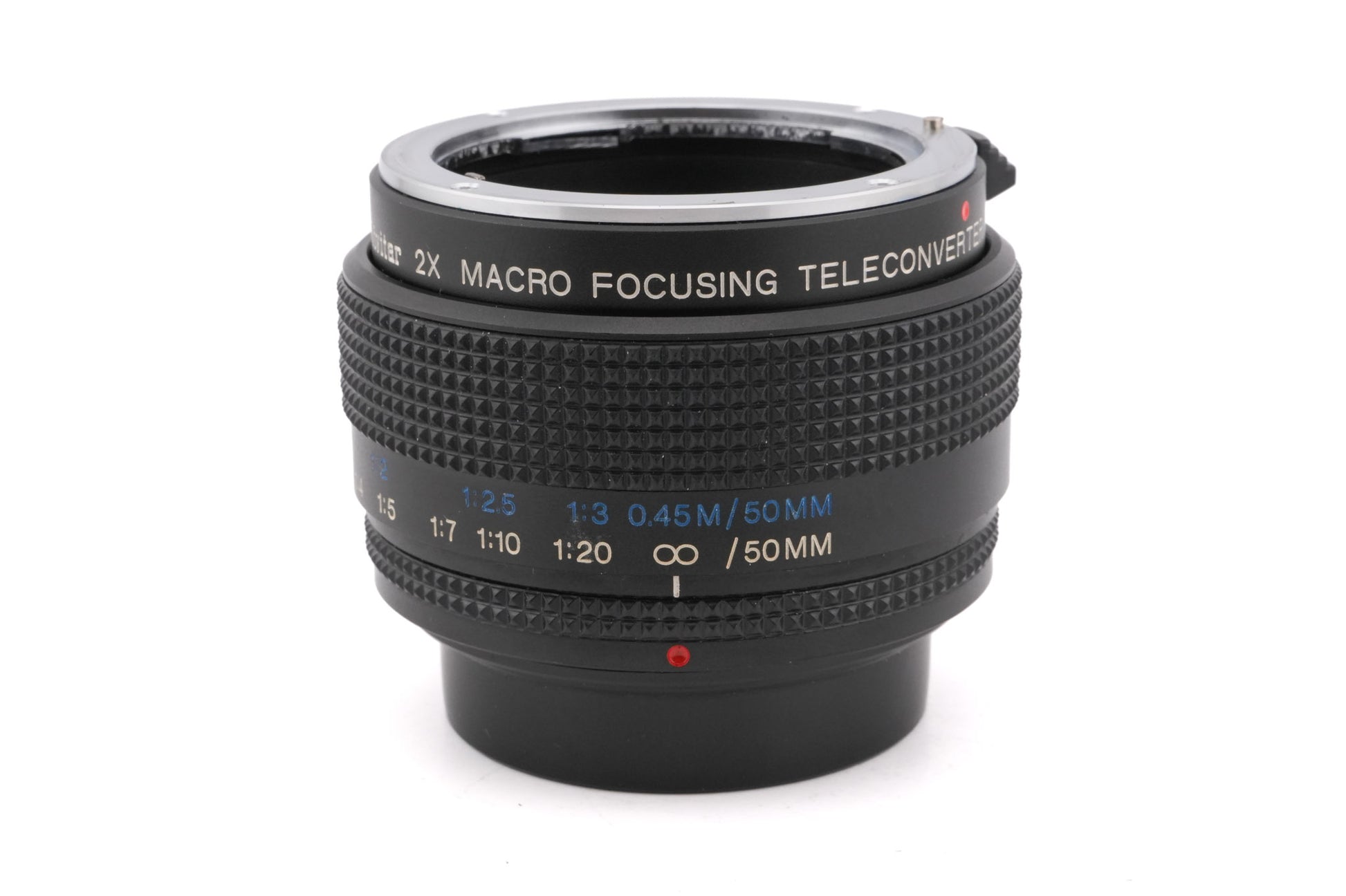 Teleconverter which works also as an extension tube. Optics are multi-coated 7-element configuration. Teleconverter multiplies focal length by two and reduces speed by two stops. Vivitar 2X Macro Focusing Teleconveter MC converts a 50mm f/1.4 lens into a 100mm f/2.8 1:1 macro.