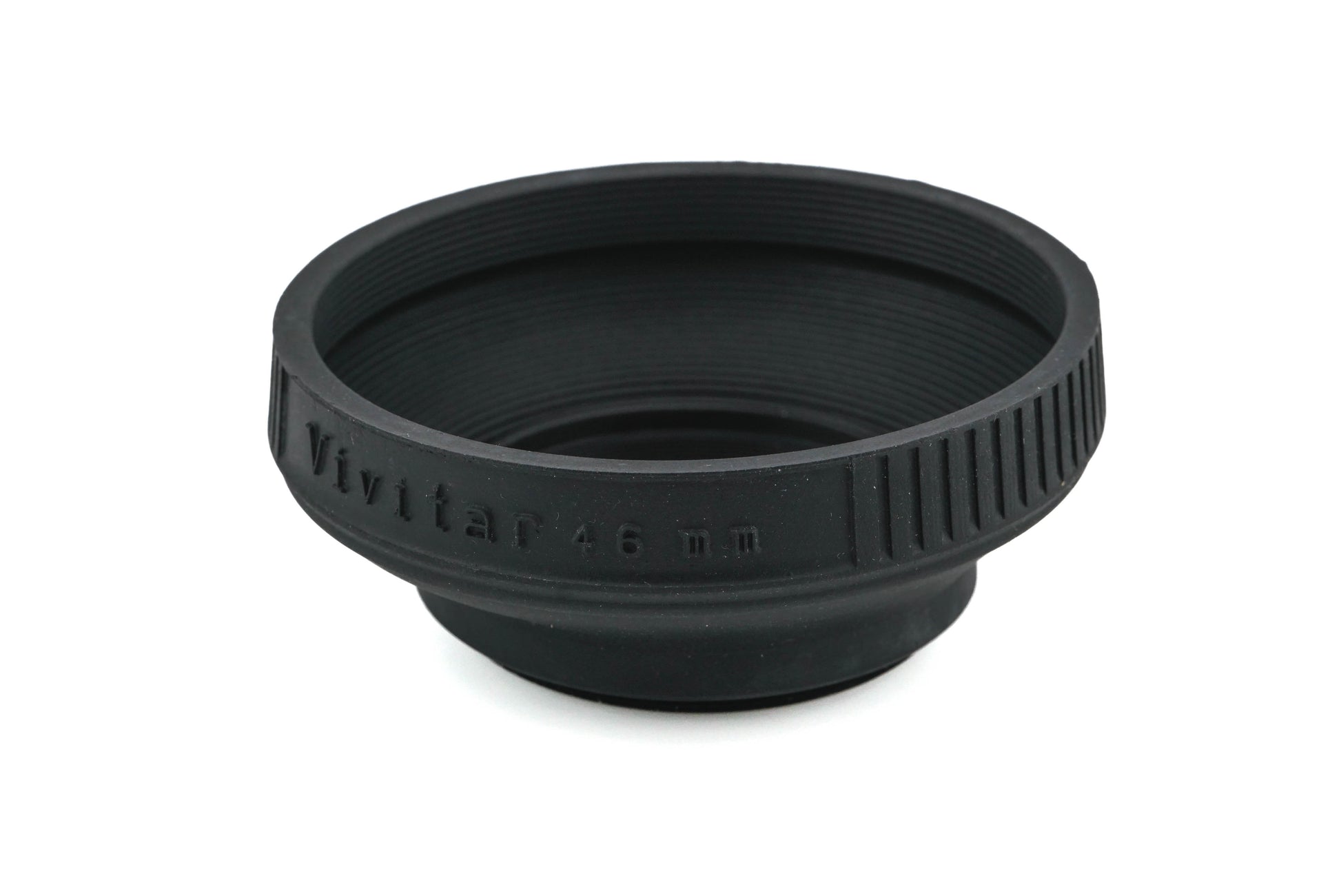 A collapsible lens hood made by Vivitar for 46mm threads. Metal reinforced rubber construction in black finish.