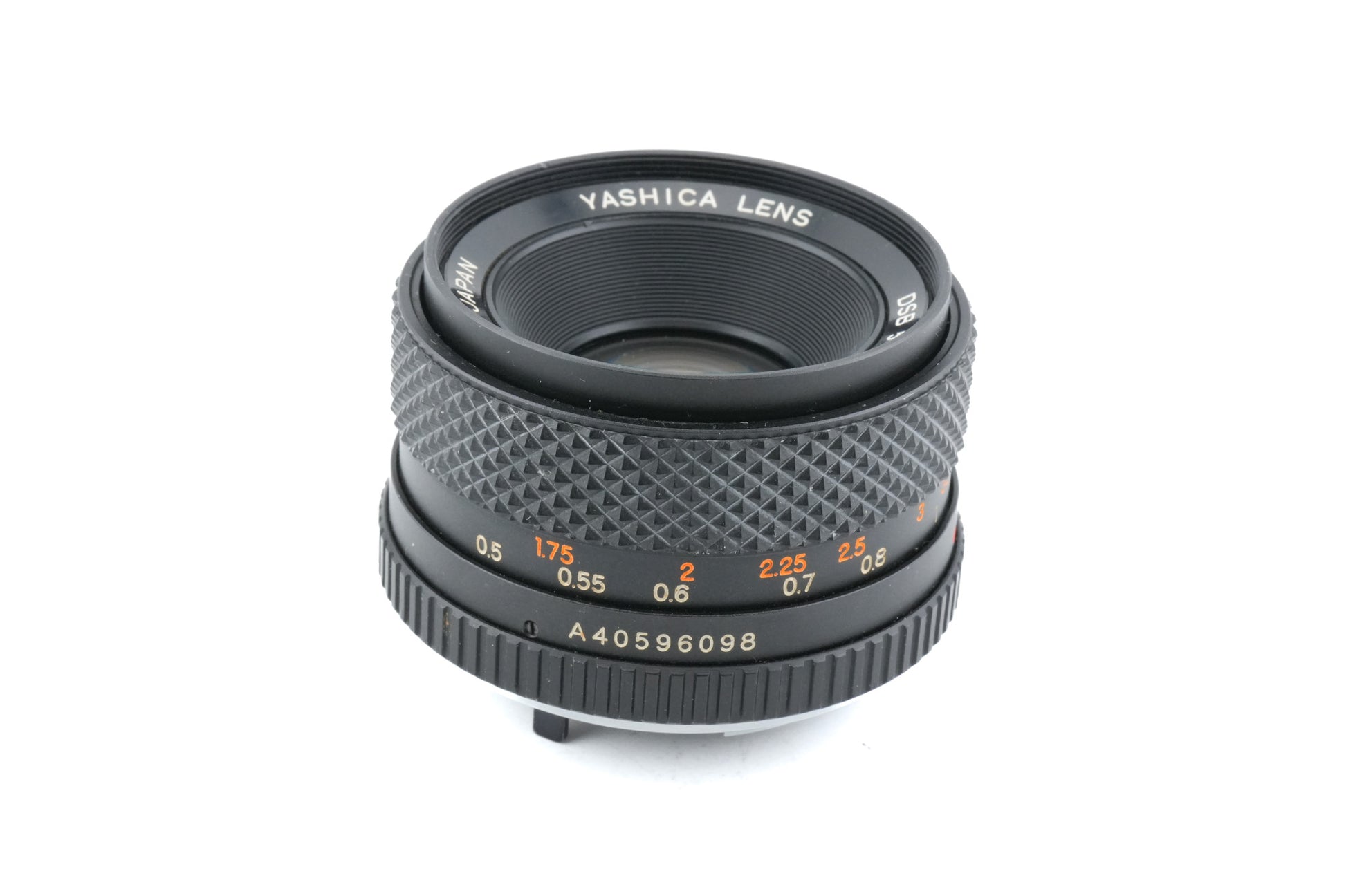 Manual focus normal lens made for Contax/Yashica mount 35mm SLRs by Yashica. DSB lenses are single-coated. Metal body available in black.
