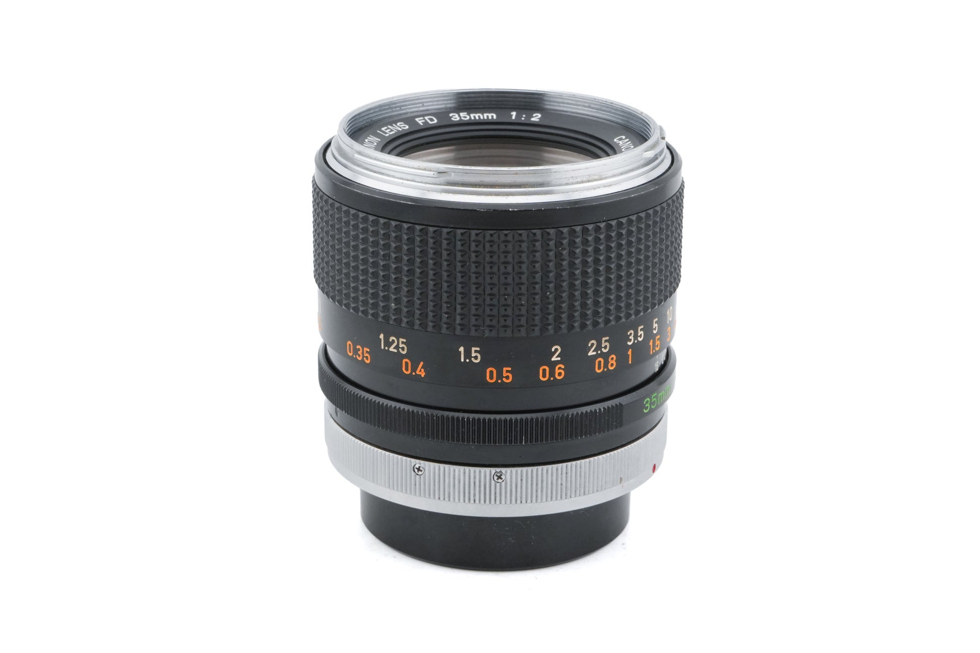 Manual focus wide normal lens made for FD mount 35mm SLRs by Canon starting in 1971. This early model is characterized by its chrome front ring and green circle on the aperture ring whereas newer lenses would have a green "A". This lens also has a concave front element and is referred to by Canon as the 35mm f2 FD (I). Metal body available in black/silver.