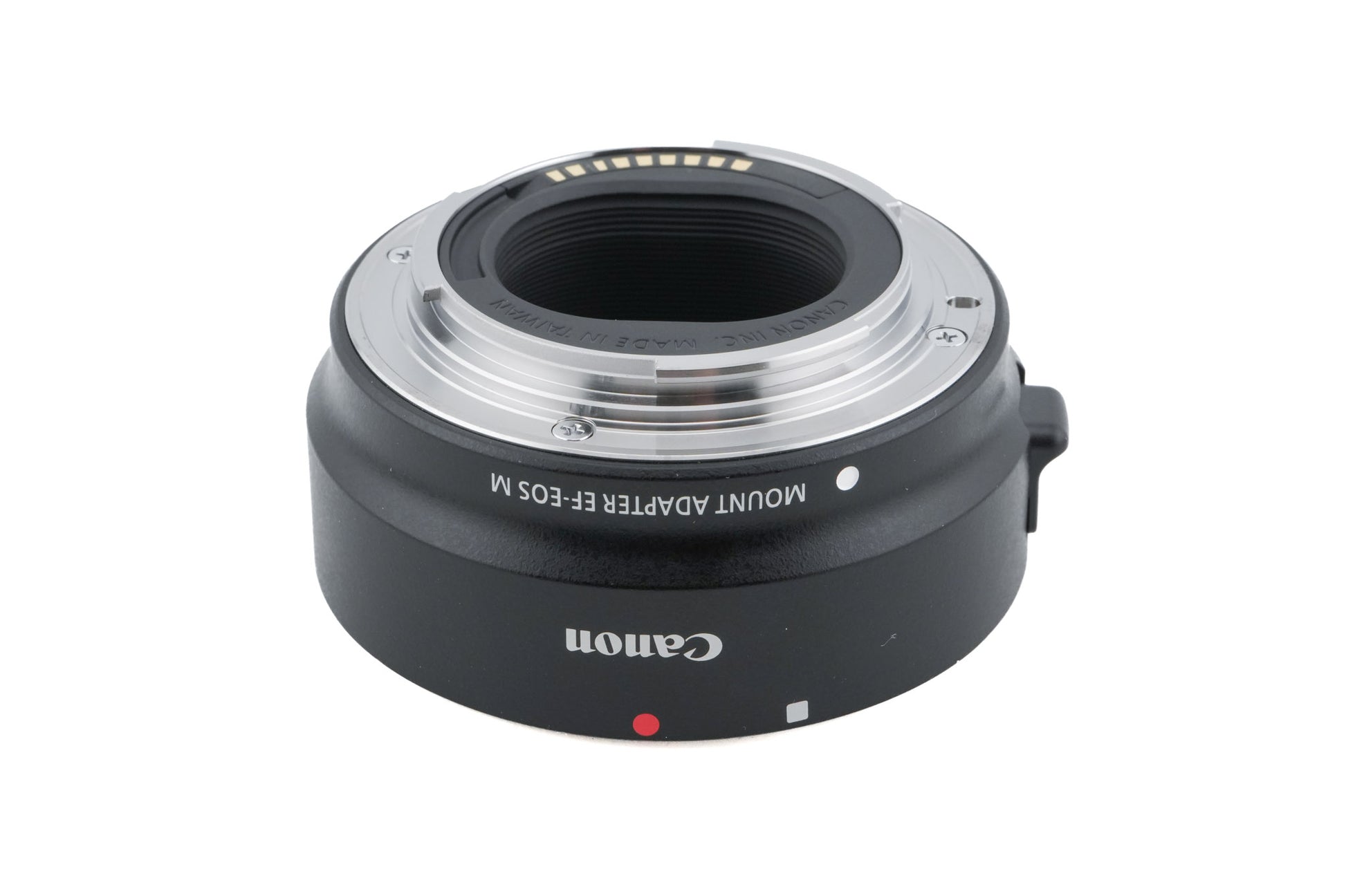 Adapter for putting EF and EF-S mount lenses on Canon EF-M-mount mirrorless digital cameras. It is not compatible with teleconverters but has electronic contacts for relaying information (f.ex, aperture and autofocus) between the lens and the camera. It was made with or without a tripod mount. Plastic body available in black.