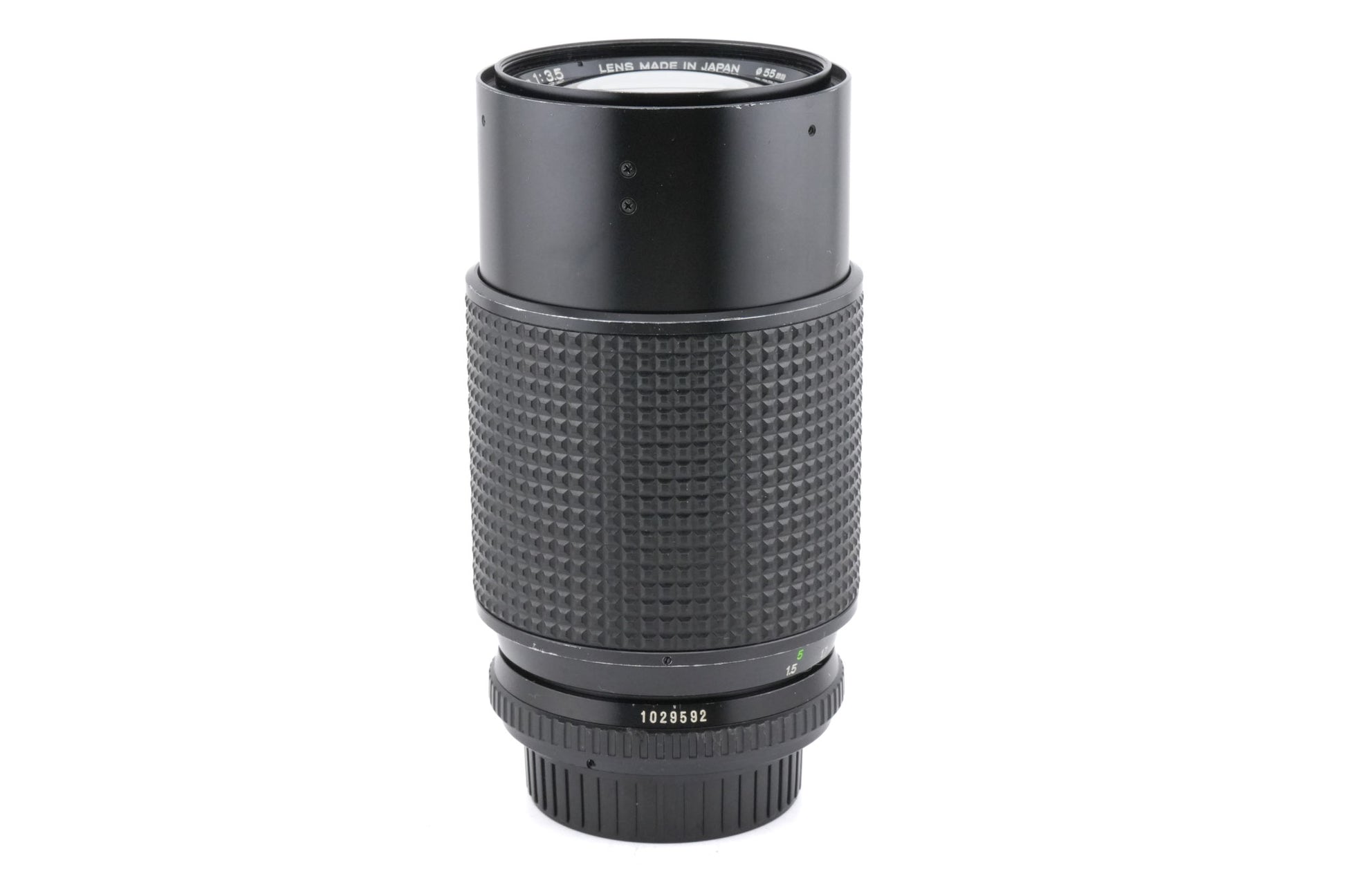 Manual focus telephoto zoom lens made for MD/SR mount 35mm SLR cameras by Minolta starting in 1981. It uses a one-touch, push/pull zoom mechanism. Metal body available in black.