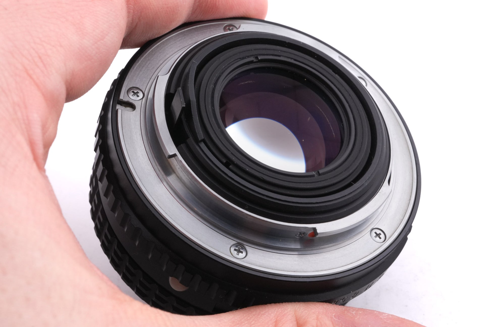 Manual focus normal lens made for K-mount 35mm SLR cameras by Pentax. It does not work with the automatic modes of later Pentax models. Plastic/metal body available in black.