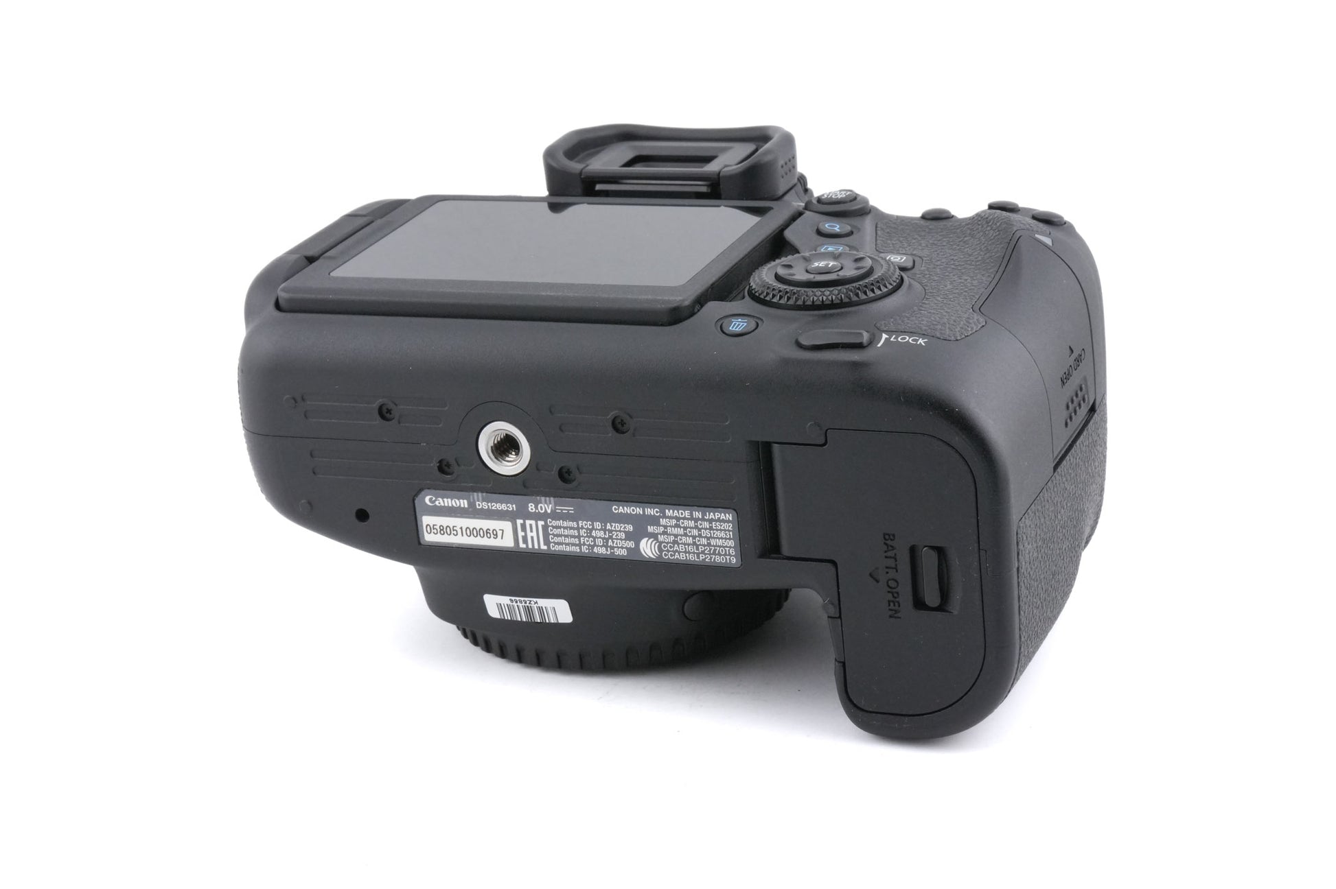Autofocus EF mount digital SLR introduced by Canon in 2017. It has a dust and splashproof body and a fully articulating 3" rear screen. Plastic/metal body available in black.