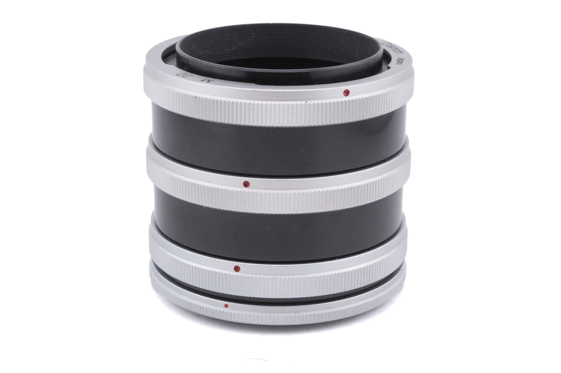 Set of extension tubes made by Canon for their FL & FD mount 35mm SLRs. These tubes allow for closer focusing at the cost of automatic aperture control. The set includes one M5, one M10, and two M20 tubes. Metal body available in black/silver.