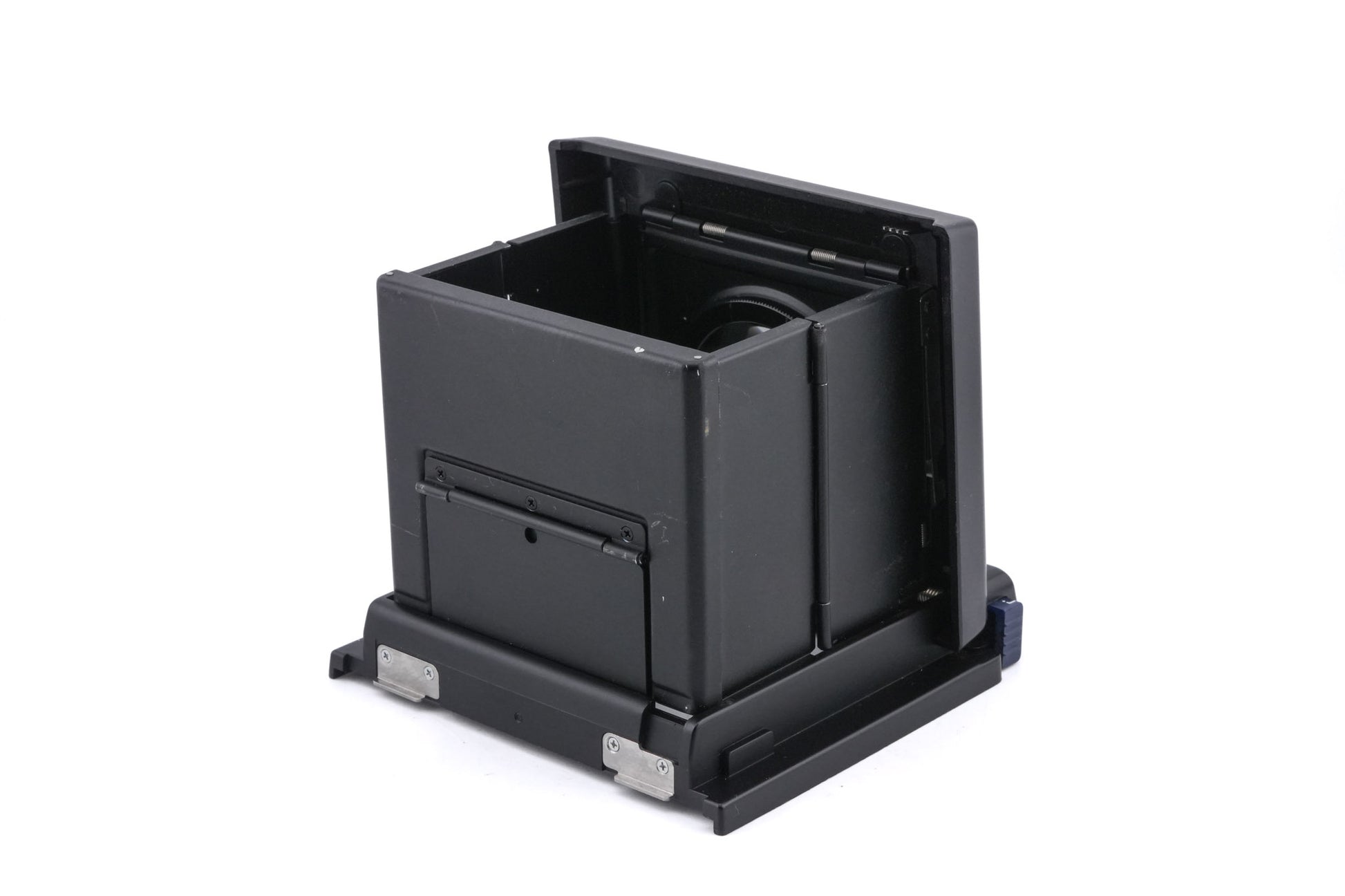Waist-level viewfinder made for the Mamiya RZ67 medium format camera introduced by Mamiya. It has a close-up focusing loupe. Metal and plastic body available in black.