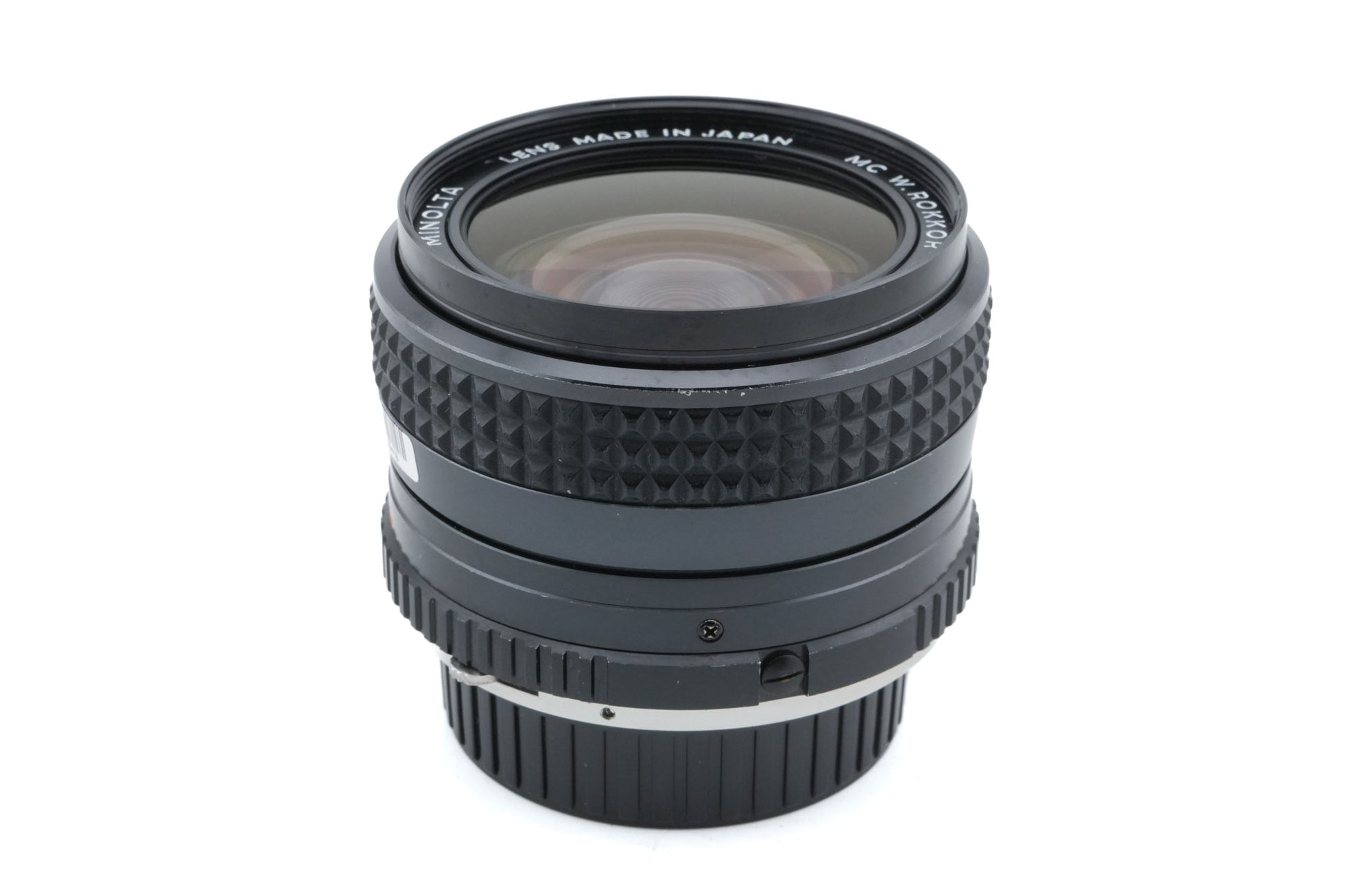 Manual focus wide-angle lens made for MD-mount 35mm SLR cameras by Minolta. Metal body in black and silver.