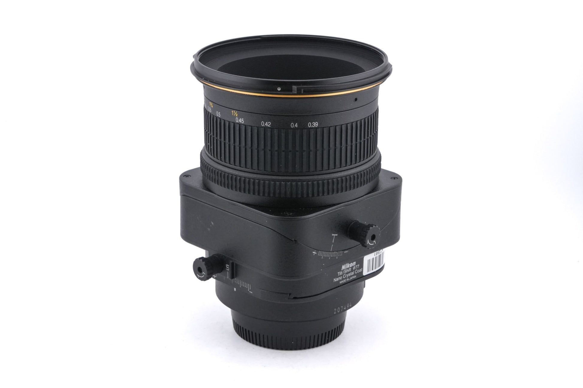 Manual focus telephoto tilt-shift lens made for F mount SLRs by Nikon starting in 2008. It is capable of 1:2 macro reproduction as well as tilt & shift movements. It features electronic contacts for communicating with digital cameras but does not have automatic aperture control or autofocus. Metal/plastic body available in black.