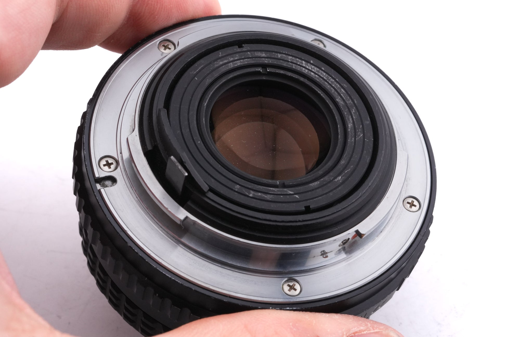 Manual focus normal lens made for K-mount 35mm SLR cameras introduced by Pentax. Early models were all-metal, but after the release of the Pentax-A line, some plastic parts were used. Metal and plastic body available in black.