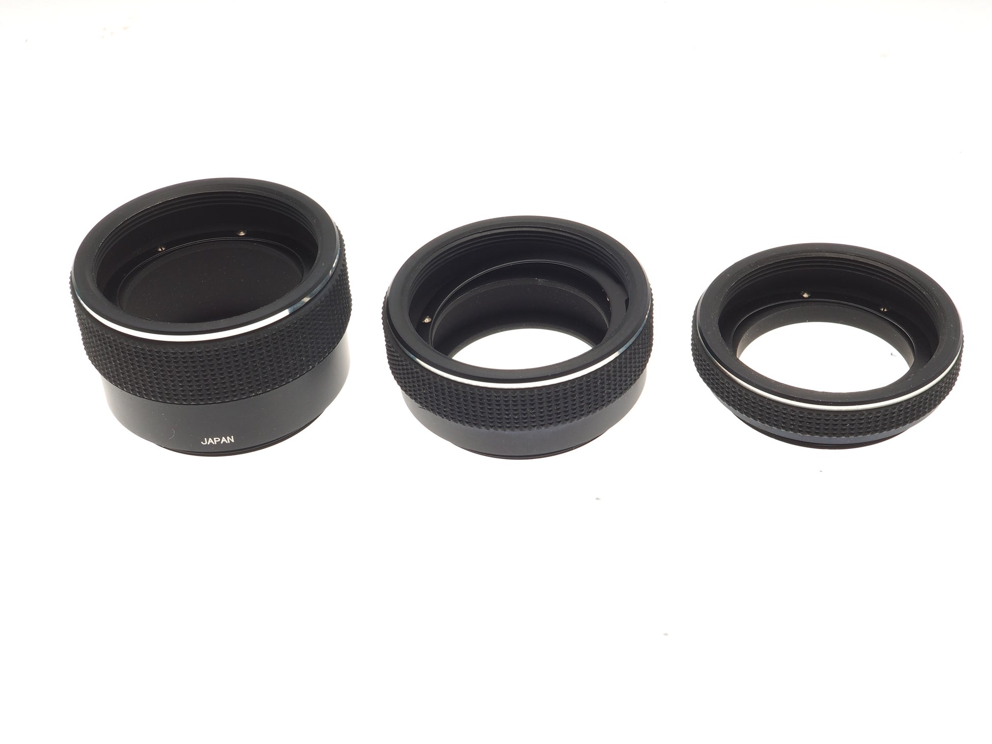 Set of 3 extension tubes by Asanuma for 35mm SLRs with M42 screw mount. They have an aperture-activation pin. Tubes are ~10, 18, and 28mm long. Black metal construction, with rubber grips and silver rings near the edges.