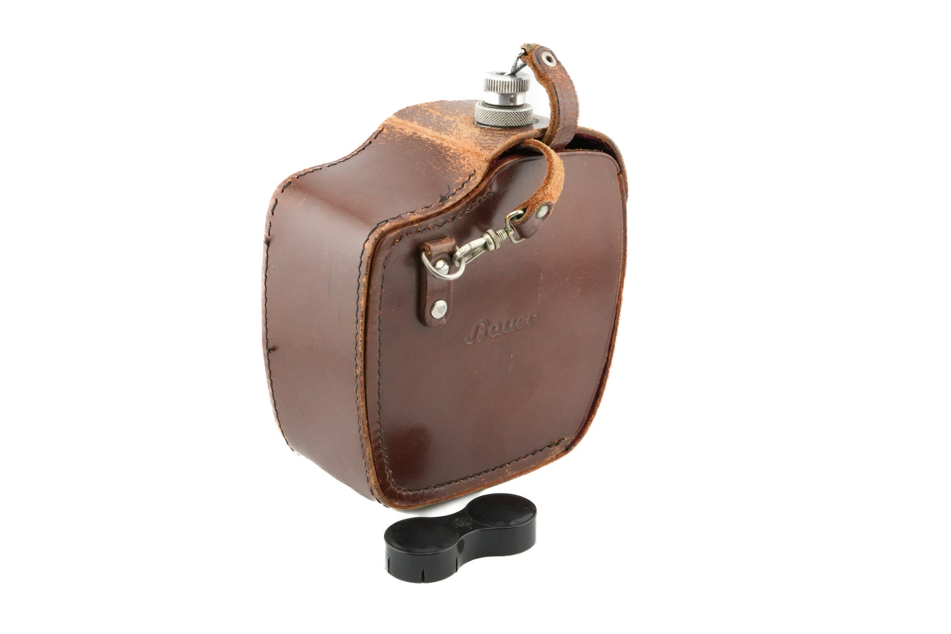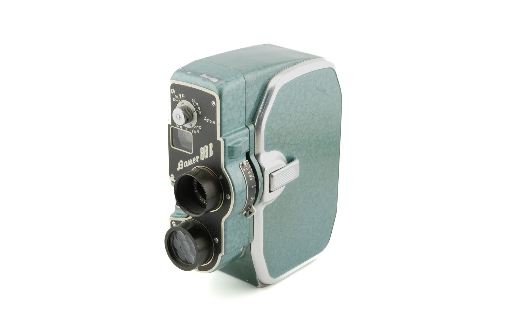 Manual focus 8mm cinema camera released by Bauer. It has a built-in selenium cell light meter. Metal body available in hammer tone turquoise.
