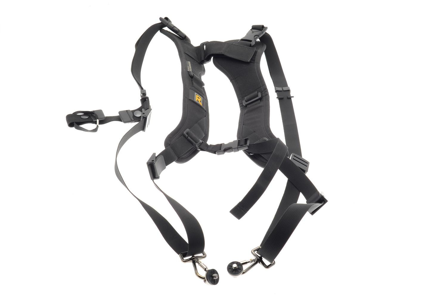 Ergonomic strap to carry two cameras around made by BlackRapid. Fabric body available in black.