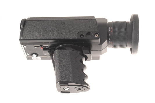 Sound super 8 movie camera by Bolex made in 1975-1976. Uses 6V Mercury battery for light meter and 6 x AA1,5V batteries for motor.